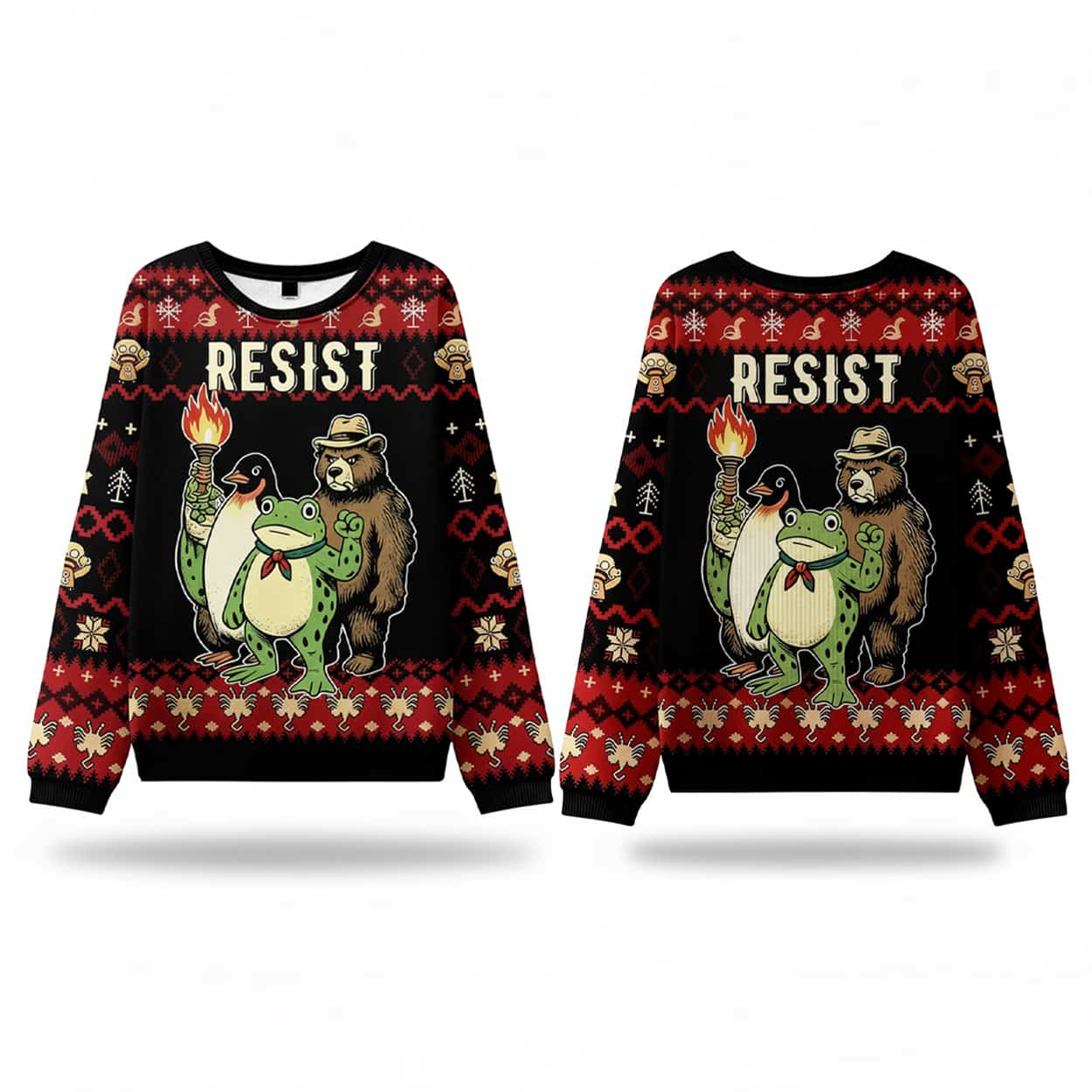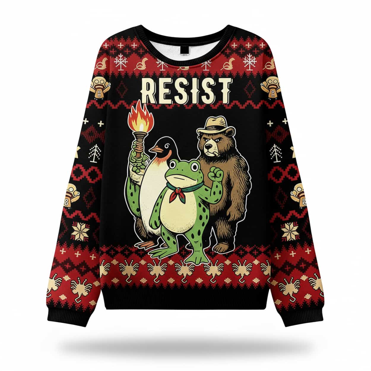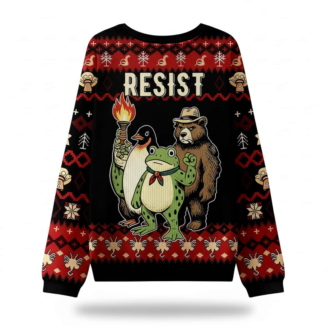 Deck the halls with defiance! This eye-catching holiday sweater blends classic Christmas charm with a splash of spirited resistance. Dominated by a red, black, and white palette, it features snowflakes, geometric patterns, and a central illustration that steals the show: a green frog hoisting a torch beside a hat-wearing bear and a stoic penguin. Above them, the bold word “RESIST” shouts from the chest like a rallying cry wrapped in tinsel. Whether you’re sipping cocoa or marching through the snow, this sweater turns heads and sparks conversations.