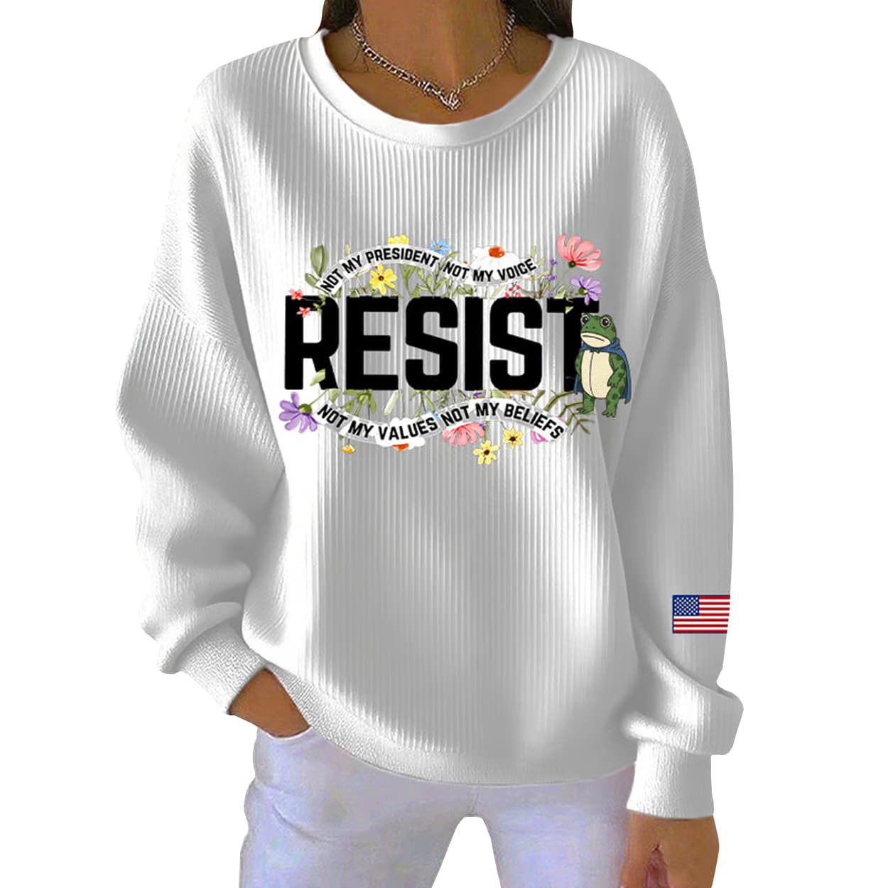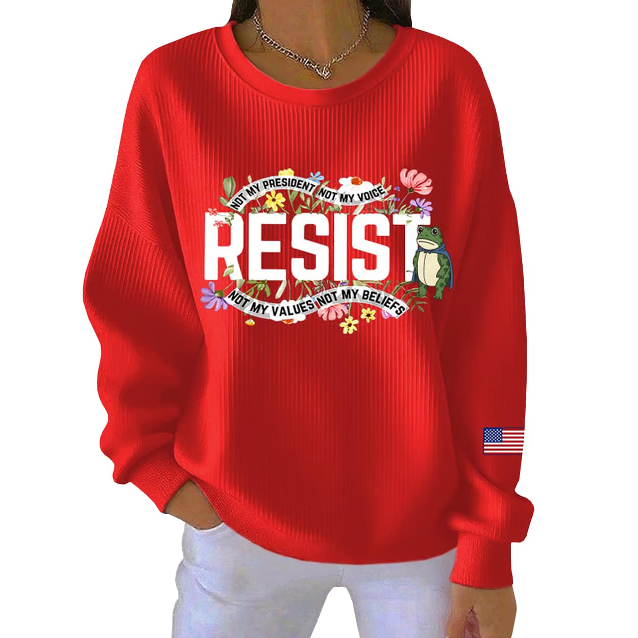 Turn heads and spark conversations with this unapologetically bold sweatshirt. The front showcases a vivid cartoon frog surrounded by a burst of colorful flowers, all framing the powerful word “RESIST” in large white block letters. Above and below, the phrases “NOT MY PRESIDENT,” “NOT MY VOICE,” “NOT MY VALUES,” and “NOT MY BELIEFS” drive the message home with clarity and conviction. A small American flag patch on the sleeve adds a cheeky nod to patriotism, while layered necklaces and crisp white pants complete the look with flair.