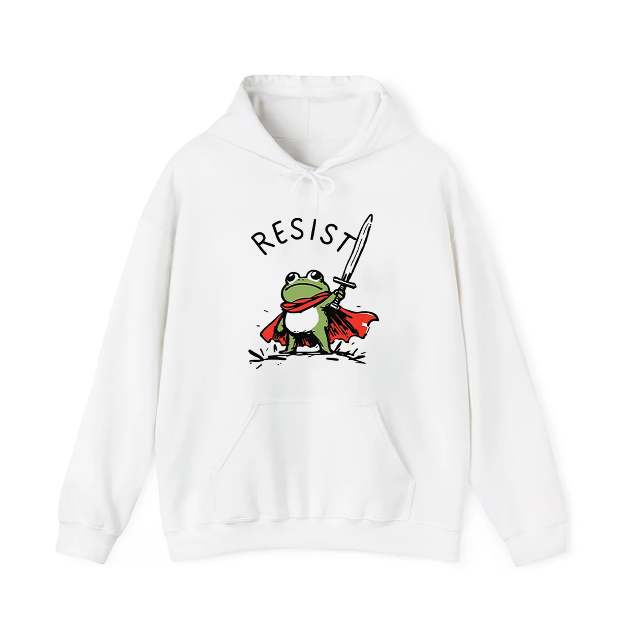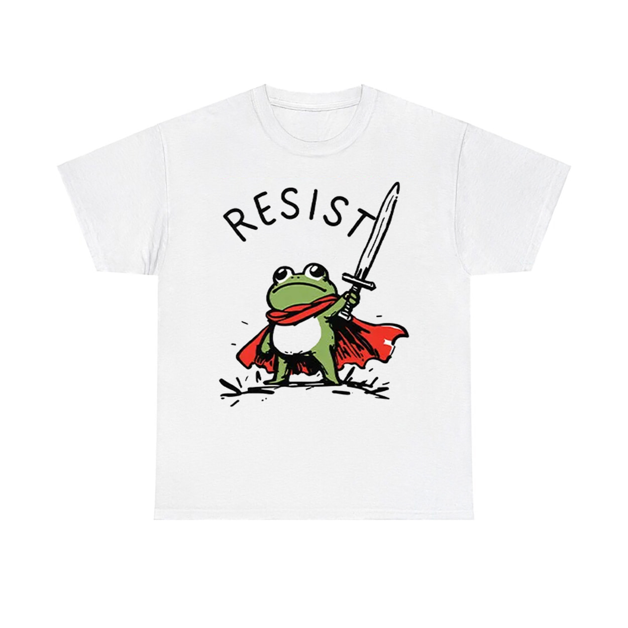 Step into the spotlight of protest fashion with this shirt. This eye-catching tee features a cartoon-style frog standing tall, sword raised, red cape billowing, and the word “RESIST” emblazoned above in bold uppercase letters. It’s not just a shirt—it’s a rallying cry wrapped in whimsy. Whether you’re marching in the streets or making a statement from your couch, this design turns heads and sparks conversation.