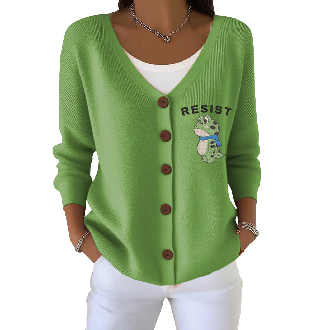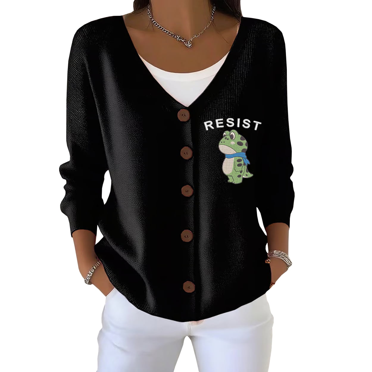 Ready to wear your resistance loud and proud? The Portland Frog Resist Cardigan is your cozy call to action. Slip it on, stand tall, and let the world know: you’re not just here to blend in—you’re here to RESIST.