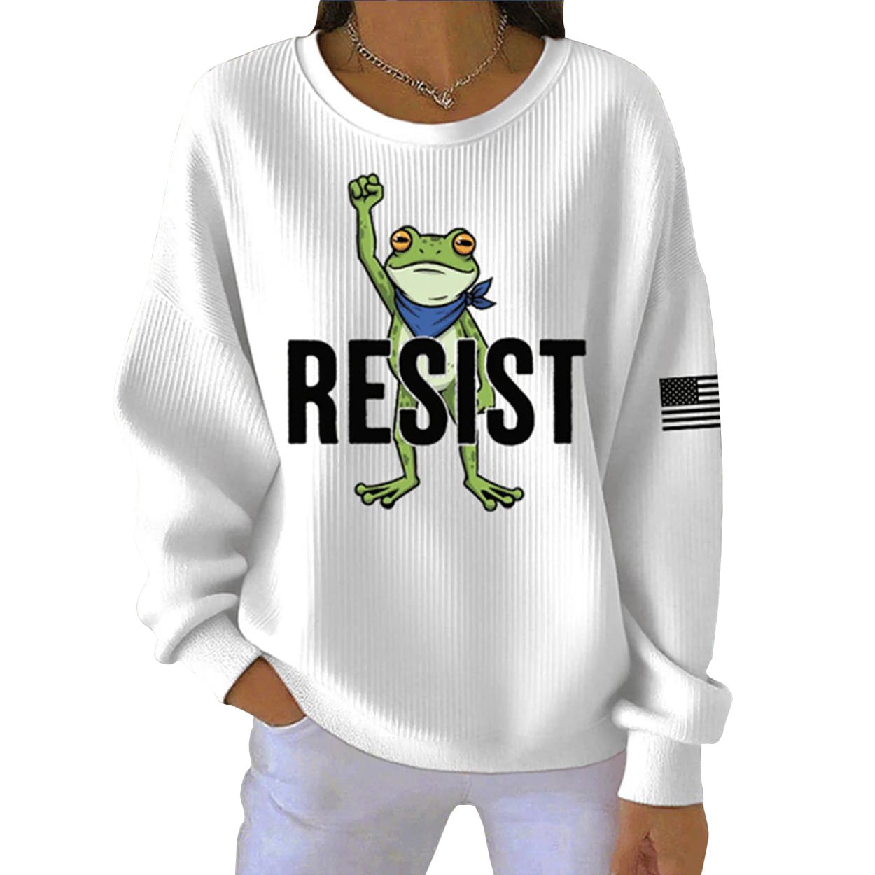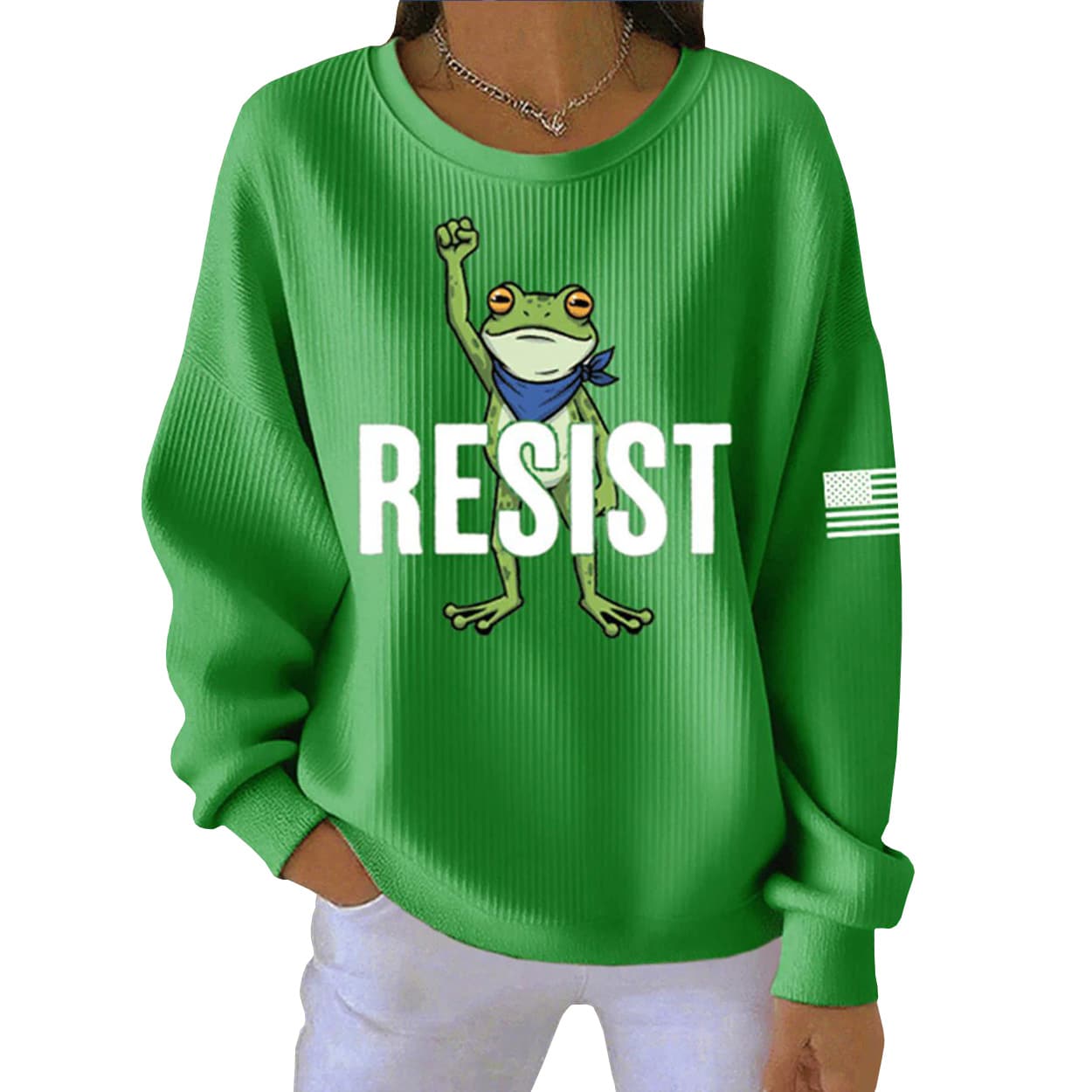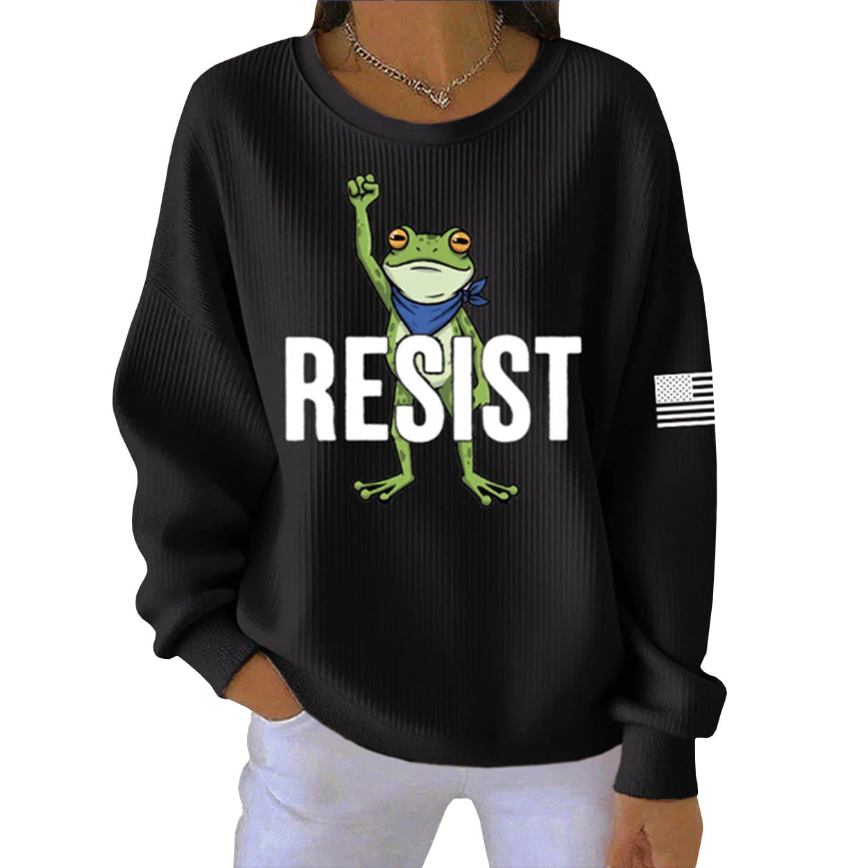 This sweatshirt is not your average pullover—it’s a rallying cry wrapped in ribbed comfort. Front and center, a cartoon frog stands tall, fist raised in defiance, sporting a blue bandana like a badge of courage. Beneath this bold amphibian, the word “RESIST” is emblazoned in stark white capital letters, making the message unmistakable. A stylized white American flag on the left sleeve adds a punch of symbolism, while the pit-striped detailing gives it a sporty edge. It’s playful, powerful, and unapologetically expressive.