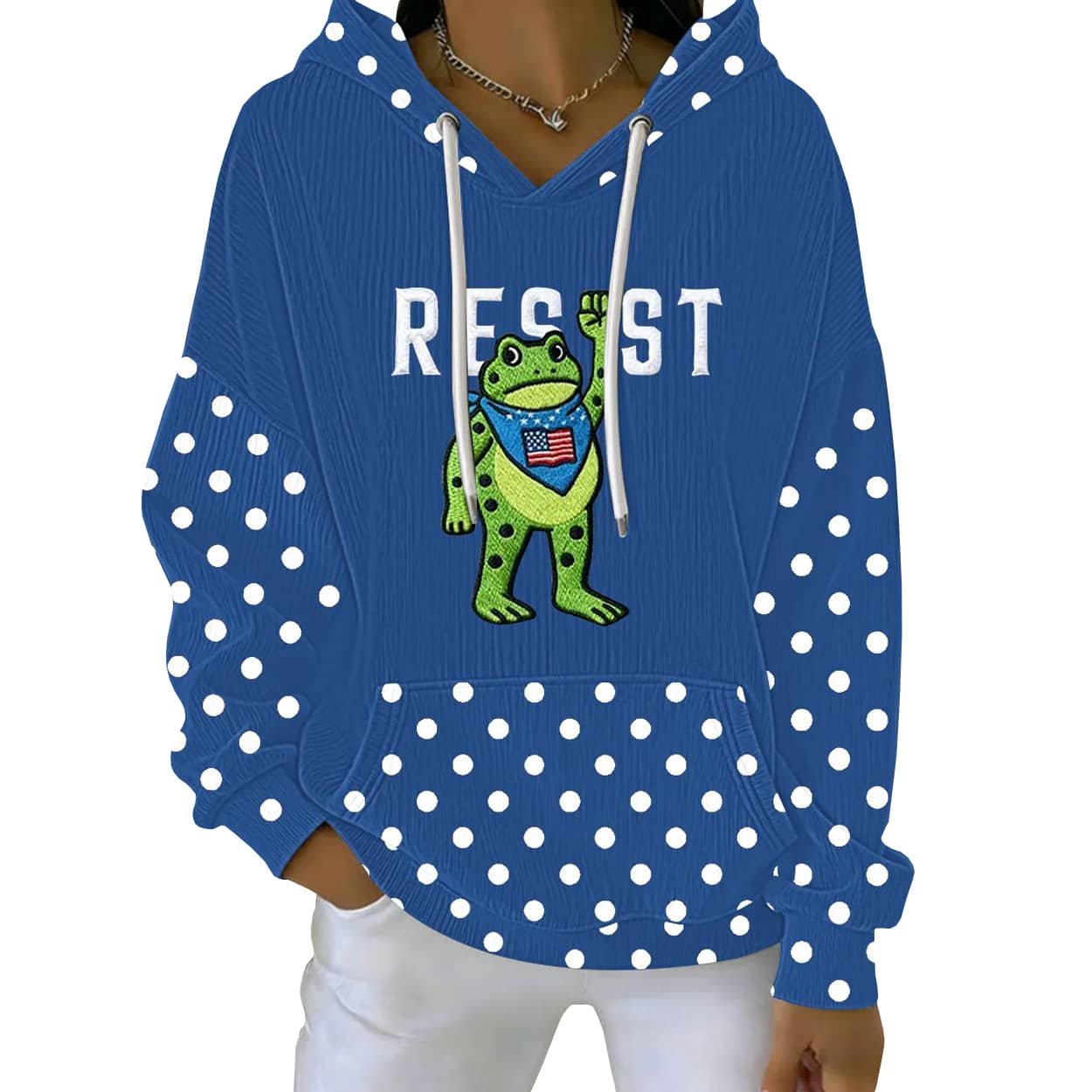 This hoodie is not your average streetwear—it’s a conversation starter wrapped in cozy rebellion. Featuring a vibrant green base with black polka dots dancing across the sleeves and lower hem, this hoodie brings texture and attitude. Front and center stands a cartoon frog, upright and defiant, rocking a blue scarf emblazoned with the American flag. With one fist raised high and the word “RESIST” boldly printed above, this amphibian isn’t just cute—it’s courageous. Ribbed pits and striped detailing add a sporty edge, while the overall vibe screams unapologetic individuality.