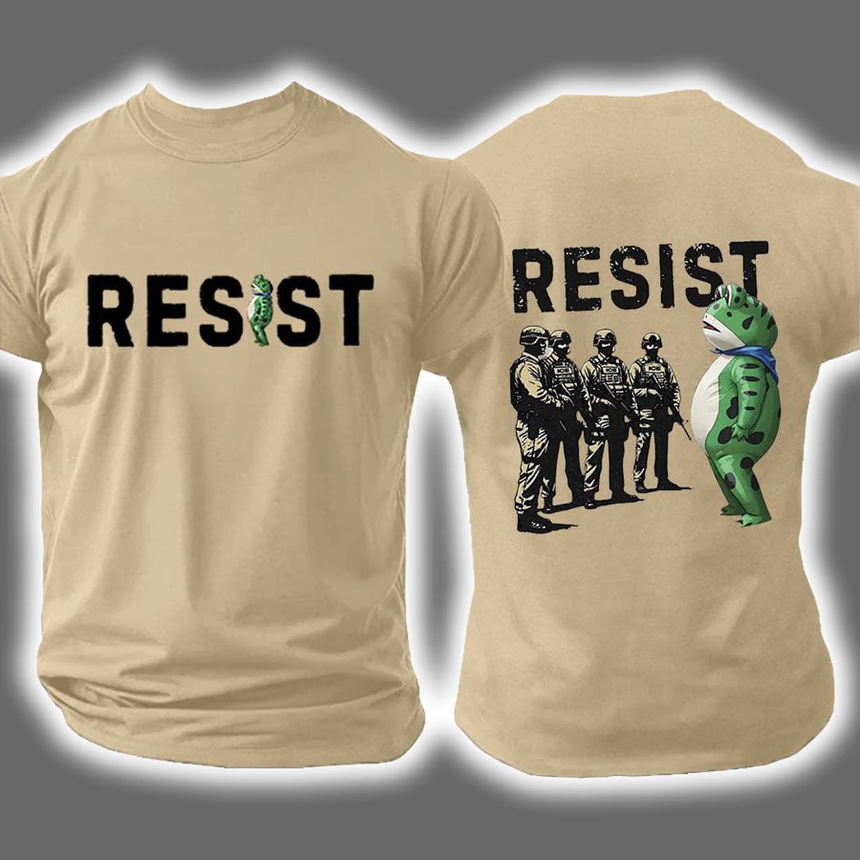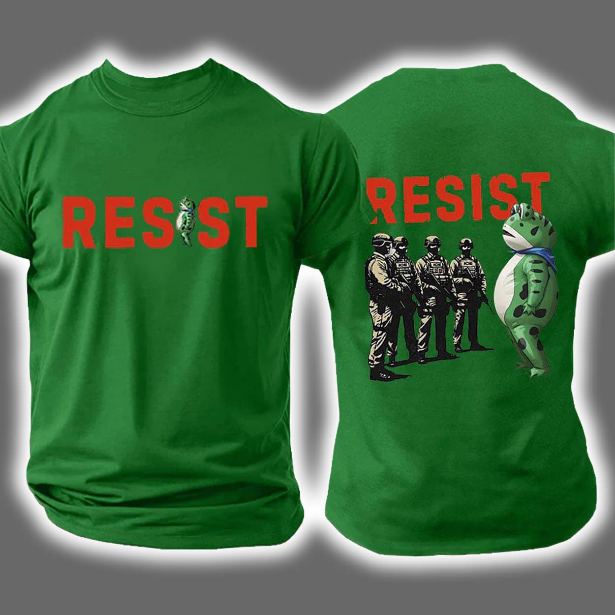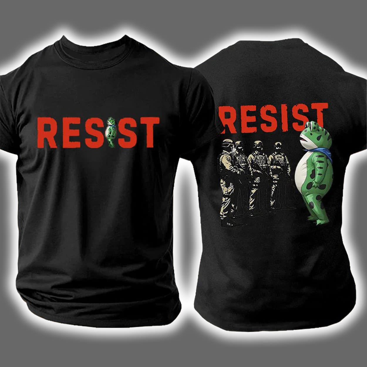 This isn’t your average protest shirt—it’s a visual mic drop. On the front, the word “RESIST” is printed in bold black caps, but with a twist: the “I” is replaced by a green frog-like character in full costume, standing proud and slightly absurd. It’s cheeky, it’s weird, and it’s wonderfully defiant. Turn it around and the back ups the ante: the same frog character faces off against a lineup of uniformed officers. Above them, “RESIST” returns like a rallying cry. It’s part satire, part statement, and all attitude.