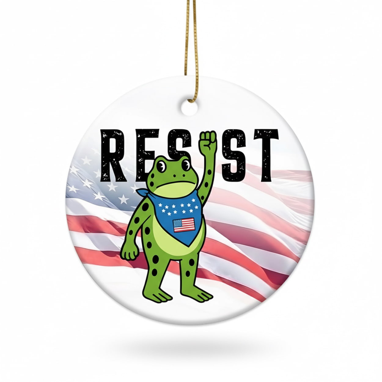 Add a splash of sass and symbolism to your tree with this ornament. This circular piece features a cartoon-style green frog standing tall, fist raised in defiance, sporting a blue bandana dotted with white stars and a miniature American flag on its chest. Behind the frog, a vibrant, waving U.S. flag sets the backdrop, while the word “RESIST” blazes across the top in bold, black capital letters. It’s not just festive—it’s fierce.