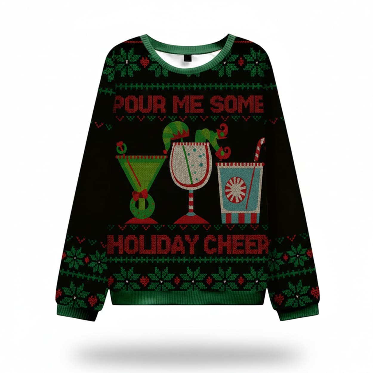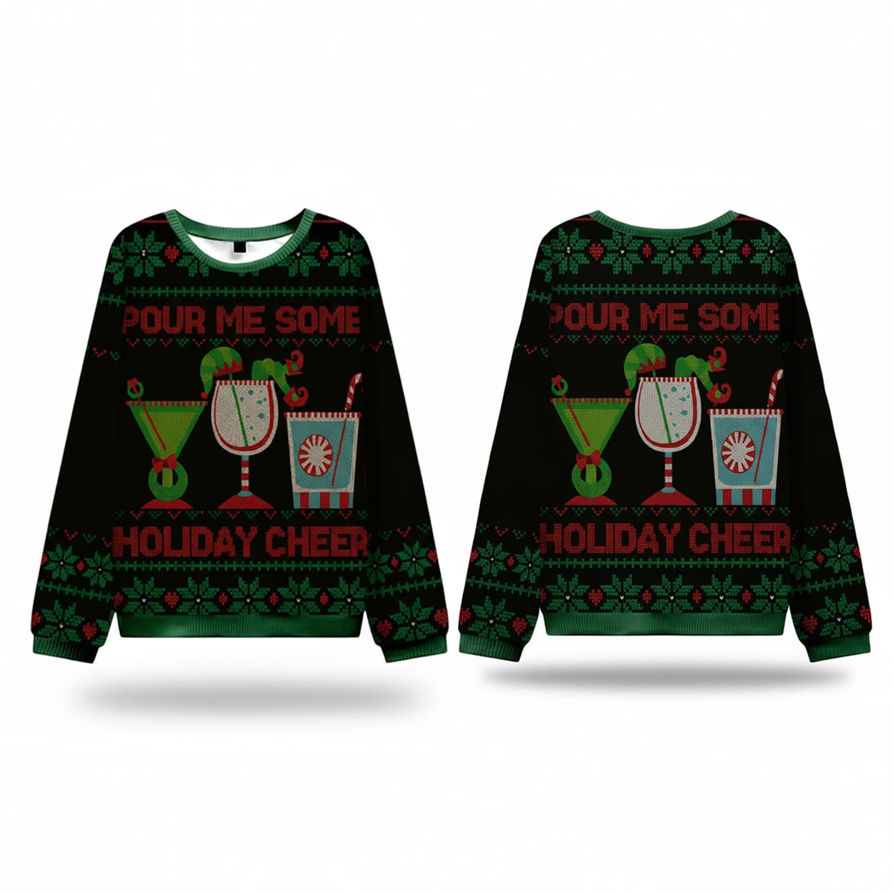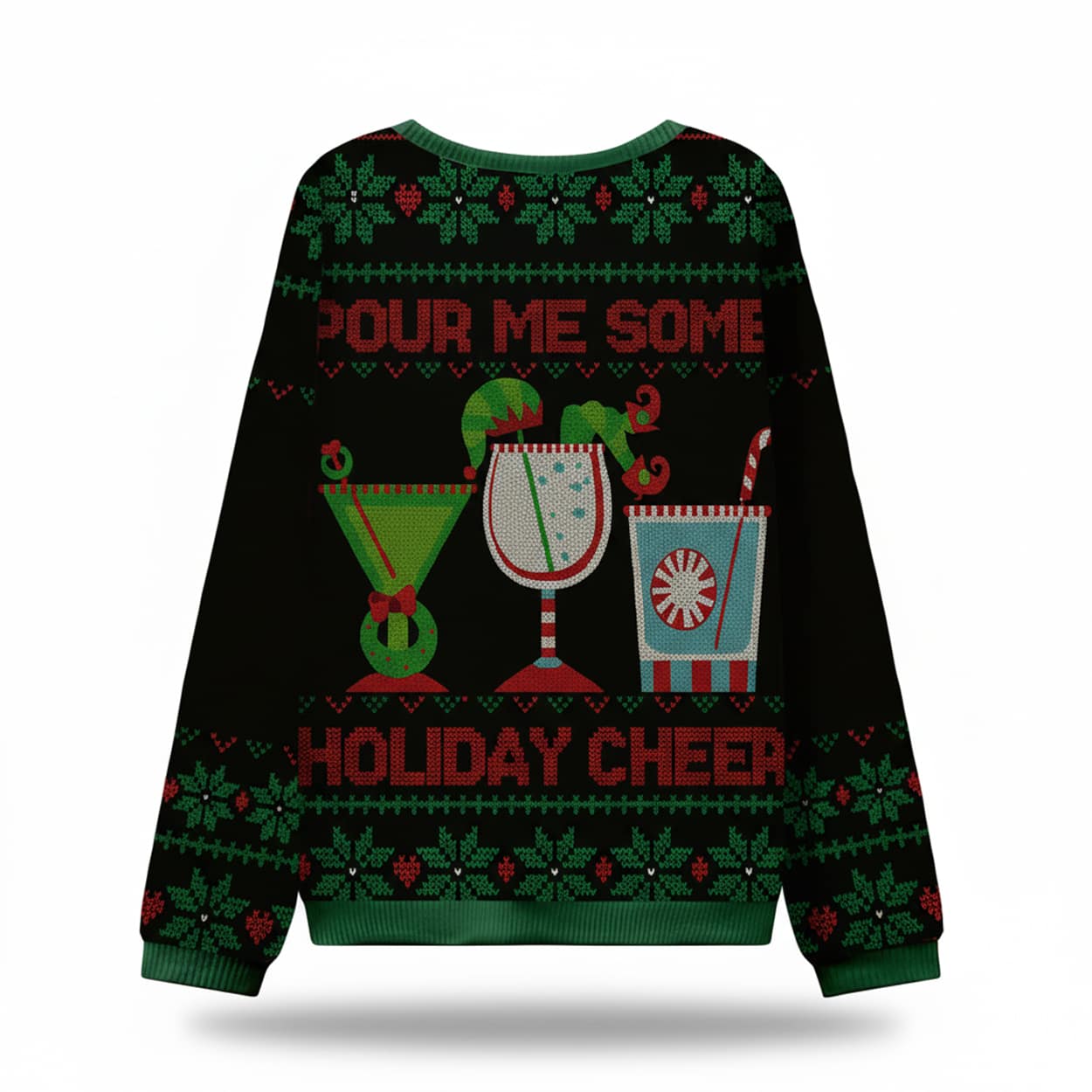 Get ready to toast the season in style! This sweater is a vibrant celebration of holiday indulgence. Set against a sleek black background, the design features three festive cocktail glasses adorned with candy canes, holly, and seasonal garnishes. Above the glasses, bold white text reads “POUR ME SOME,” while below, it finishes with “HOLIDAY CHEER.” Snowflakes and holly leaves in red and green frame the scene, creating a merry vibe from top to bottom. With matching patterns on both front and back, this sweater is a full-circle tribute to holiday revelry.