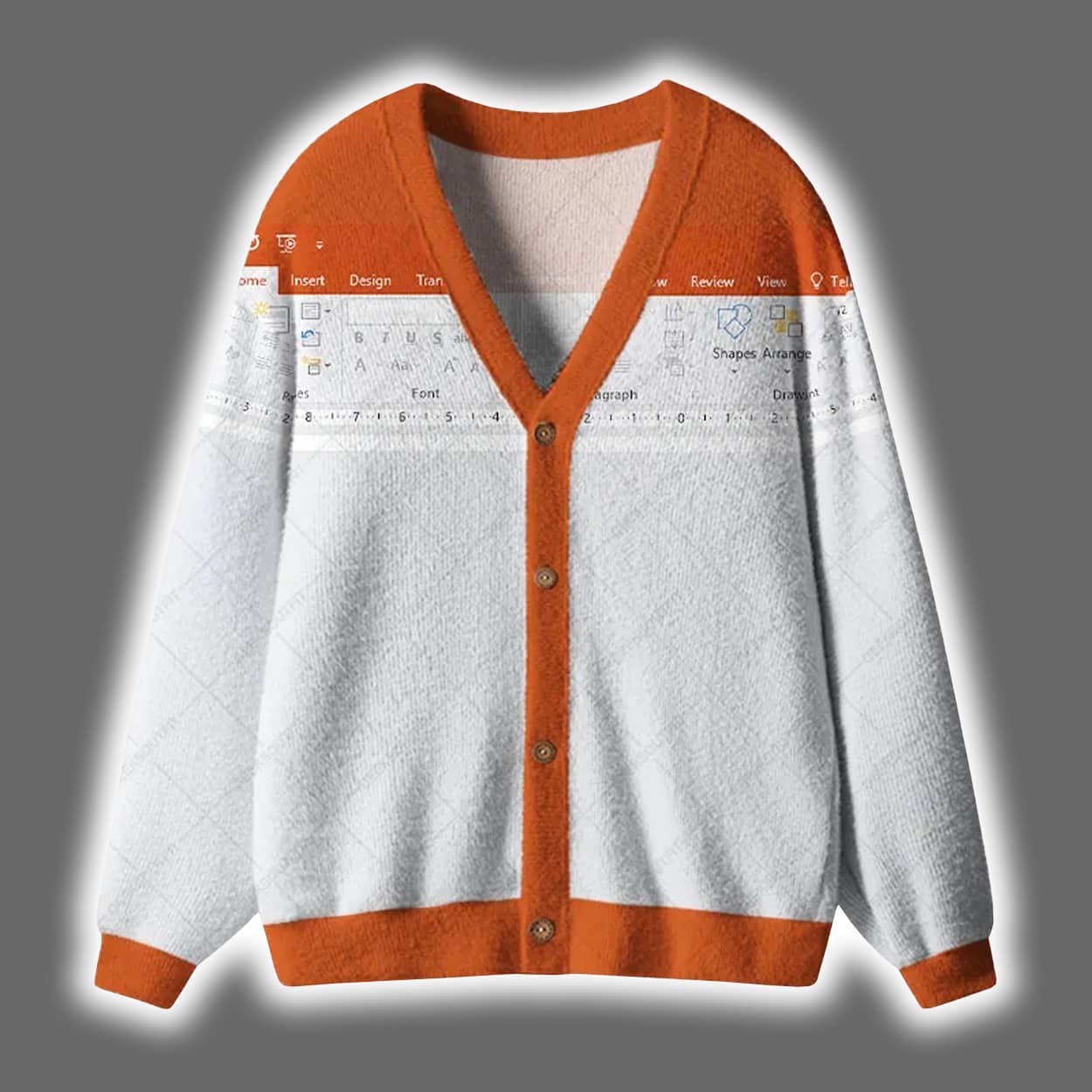 Designed for the witty, the nerdy, and the unapologetically clever, this cardigan celebrates the unsung heroes of the office—the presenters, the analysts, the spreadsheet warriors. The back graphic playfully mimics the chaos of a last-minute slide deck, making it a wearable inside joke for anyone who’s ever clicked “next slide” with a sigh. It’s a nod to the thinkers who turn data into drama and meetings into magic.