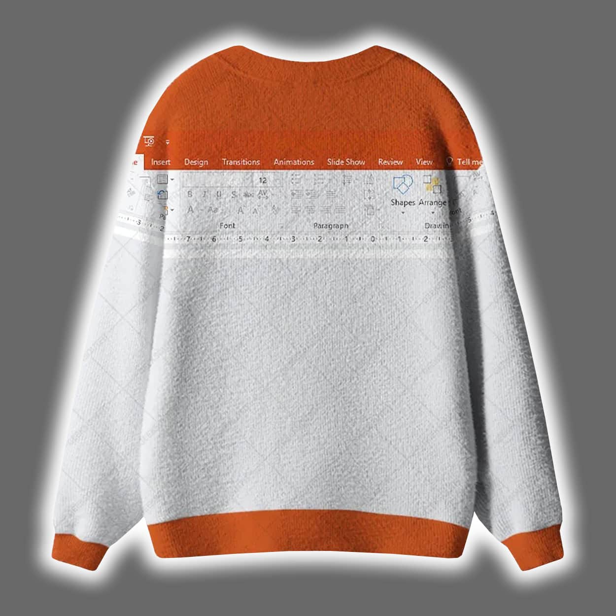 This isn’t your average holiday sweater—it’s a wearable punchline for anyone who’s ever survived a PowerPoint marathon. The cardigan features a bold orange upper section with crisp white sleeves and body, accented by a V-neck and button-down front. But the real showstopper is on the back: a horizontal band resembling a presentation slide, complete with cryptic symbols and notation that hint at musical scores or mathematical formulas.