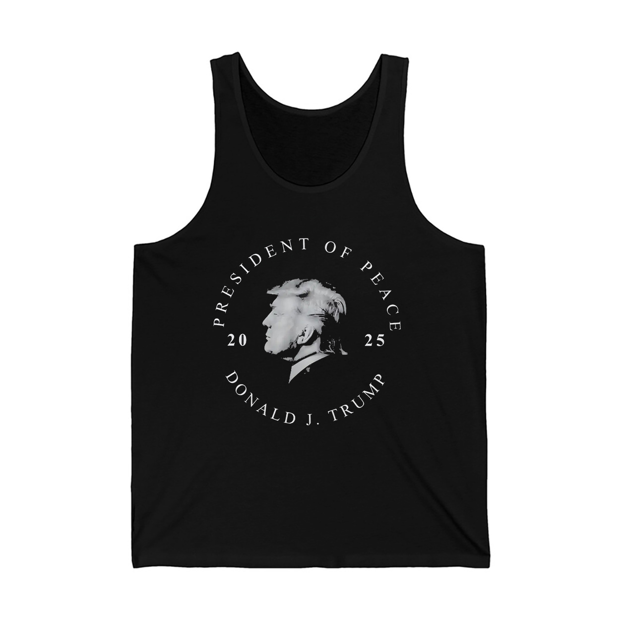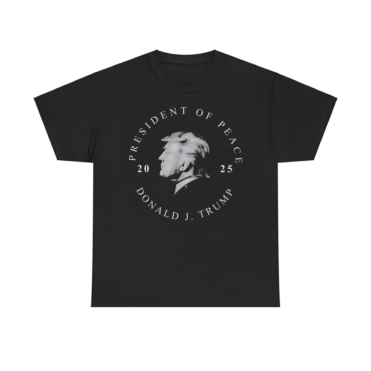 This design isn’t just about politics—it’s about perspective. The phrase “President of Peace” invites reflection on leadership through strength, diplomacy, and conviction. The grayscale palette adds a timeless quality, while the symmetrical layout gives the shirt a sense of order and purpose. It’s made for those who see beyond the headlines and believe in the power of bold ideas.