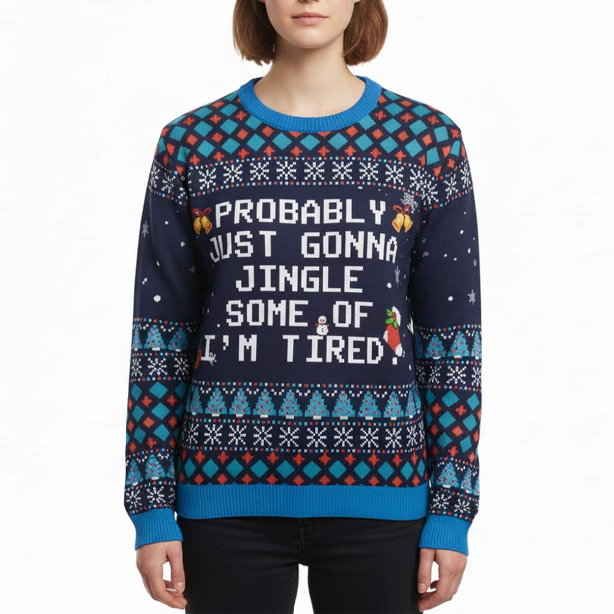 This cozy masterpiece features a dark blue backdrop sprinkled with red and blue diamonds, white snowflakes, and Christmas trees. The cuffs, collar, and hem pop in bright blue, adding just enough energy to say “I tried.” Front and back, bold white block letters proclaim: “PROBABLY JUST GONNA JINGLE SOME OF THE WAY. I’M TIRED.” Surrounding the text are tiny icons—bells, stockings, and gifts—like exhausted emojis of seasonal obligation.