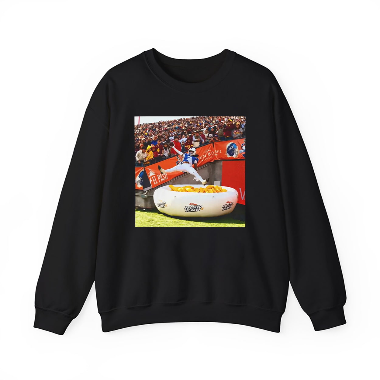 Turn heads and spark conversations with this shirt, a wearable snapshot of one of the most jaw-dropping moments in recent college football. The front graphic captures Que’Sean Brown mid-flight, arms outstretched, legs splayed, diving heroically into a giant bowl of Frosted Flakes just beyond the end zone. With stadium signage like “EL PASO” and “SUN BOWL” in the background, this shirt immortalizes the touchdown celebration that had fans and cereal lovers alike buzzing. It’s not just a tee—it’s a viral moment you can wear.