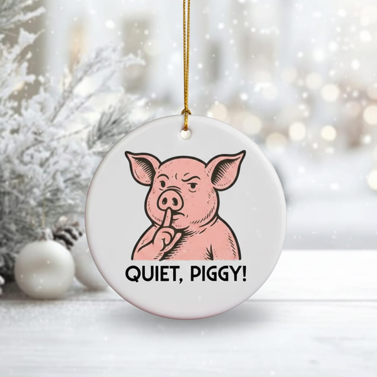 This ornament is a whimsical addition to any festive setup. Featuring a cartoon pig with a stern expression and one hoof raised in a classic “shushing” gesture, this round ornament delivers its message loud and clear: “QUIET, PIGGY!” printed boldly beneath the illustration. Whether you’re gifting it or keeping it for yourself, this ornament is guaranteed to spark conversation and laughter.