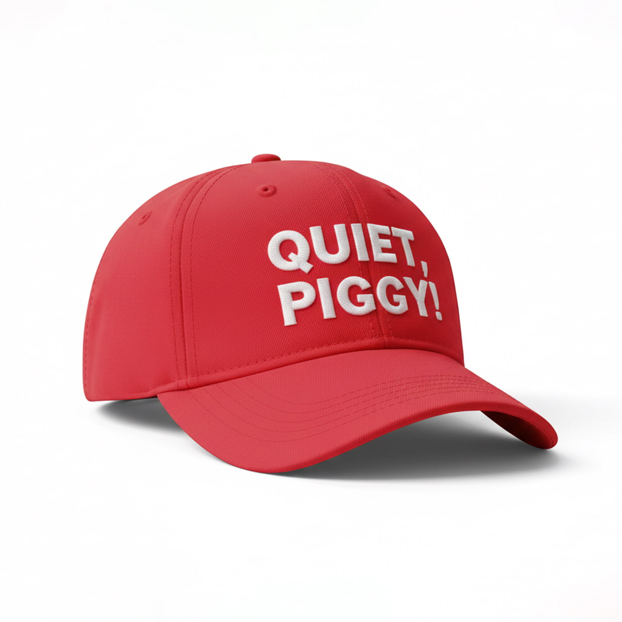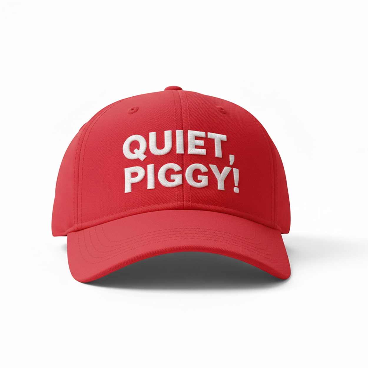 Make way for the ultimate conversation starter. This fiery red cap features bold white embroidery that reads “QUIET, PIGGY!”—a phrase that exploded into pop culture after a tense exchange between President Donald Trump and a reporter aboard Air Force One. With its structured design and curved brim, this hat doesn’t just sit on your head—it makes a statement. Whether you’re at a rally, a comedy show, or just strolling through town, this cap is your ticket to turning heads and raising eyebrows.
