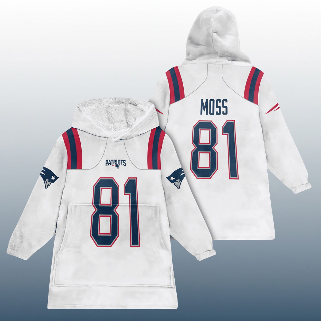 This hoodie is a fan-favorite fusion of sporty swagger and chill-day comfort. This hoodie features the iconic number “81” in bold white and red on both the front and back—an unmistakable nod to gridiron greatness. The front proudly displays “PATRIOTS” above the number, while the back showcases the name “MOSS” in crisp white lettering, honoring one of the most electrifying wide receivers in history. Red and white shoulder stripes add a vintage touch, and the Patriots logo on each sleeve seals the deal. Whether you’re binge-watching games or braving the cold, this hoodie makes every moment feel like a touchdown.