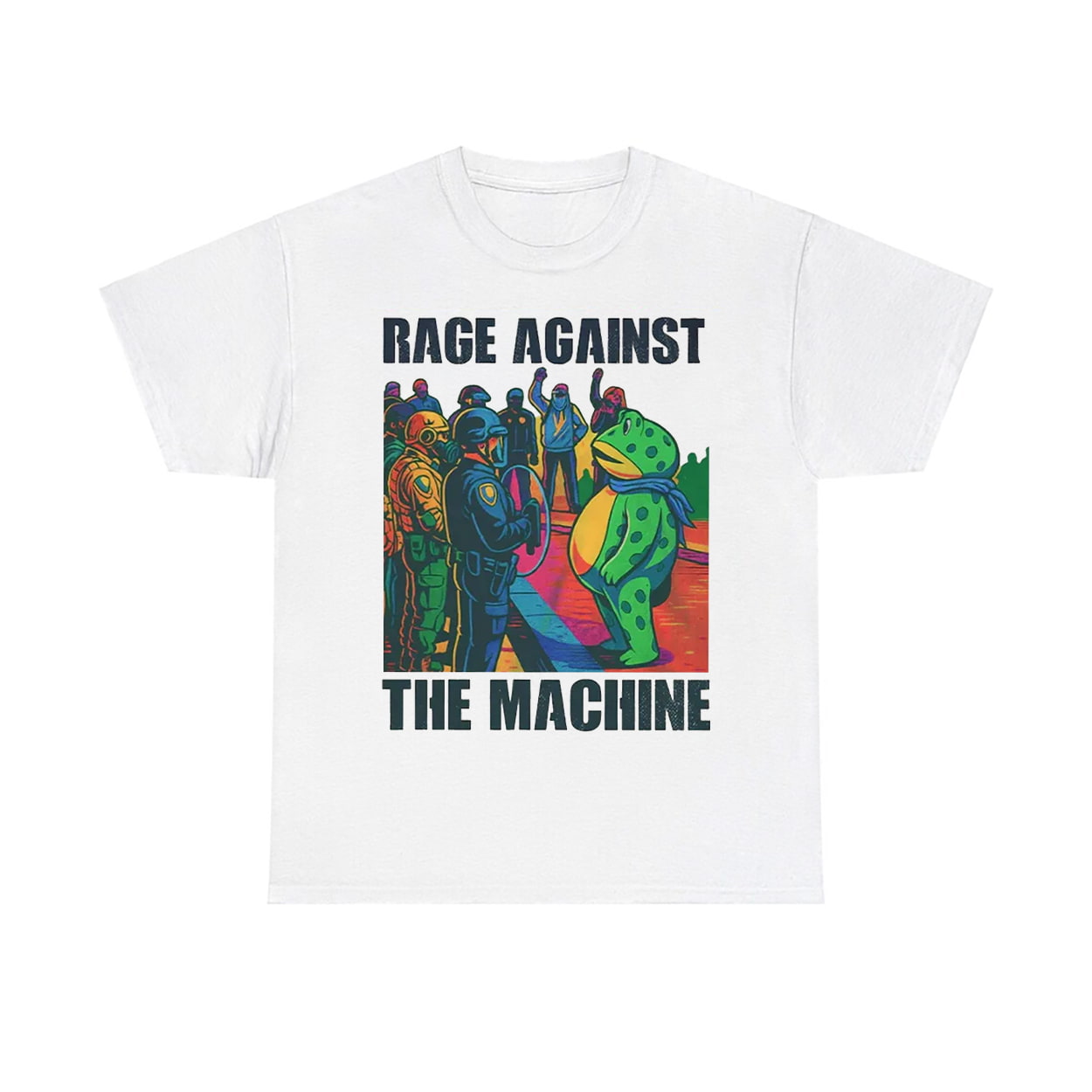 Turn heads and spark conversations with this shirt. This eye-catching tee showcases a surreal scene: a line of riot police in full gear facing a lone figure in a bright green frog-like dinosaur costume, standing defiantly on a rainbow-colored street. Framed by the bold text “RAGE AGAINST THE MACHINE,” the image is both humorous and provocative—a visual metaphor for standing out, speaking up, and challenging authority with flair.