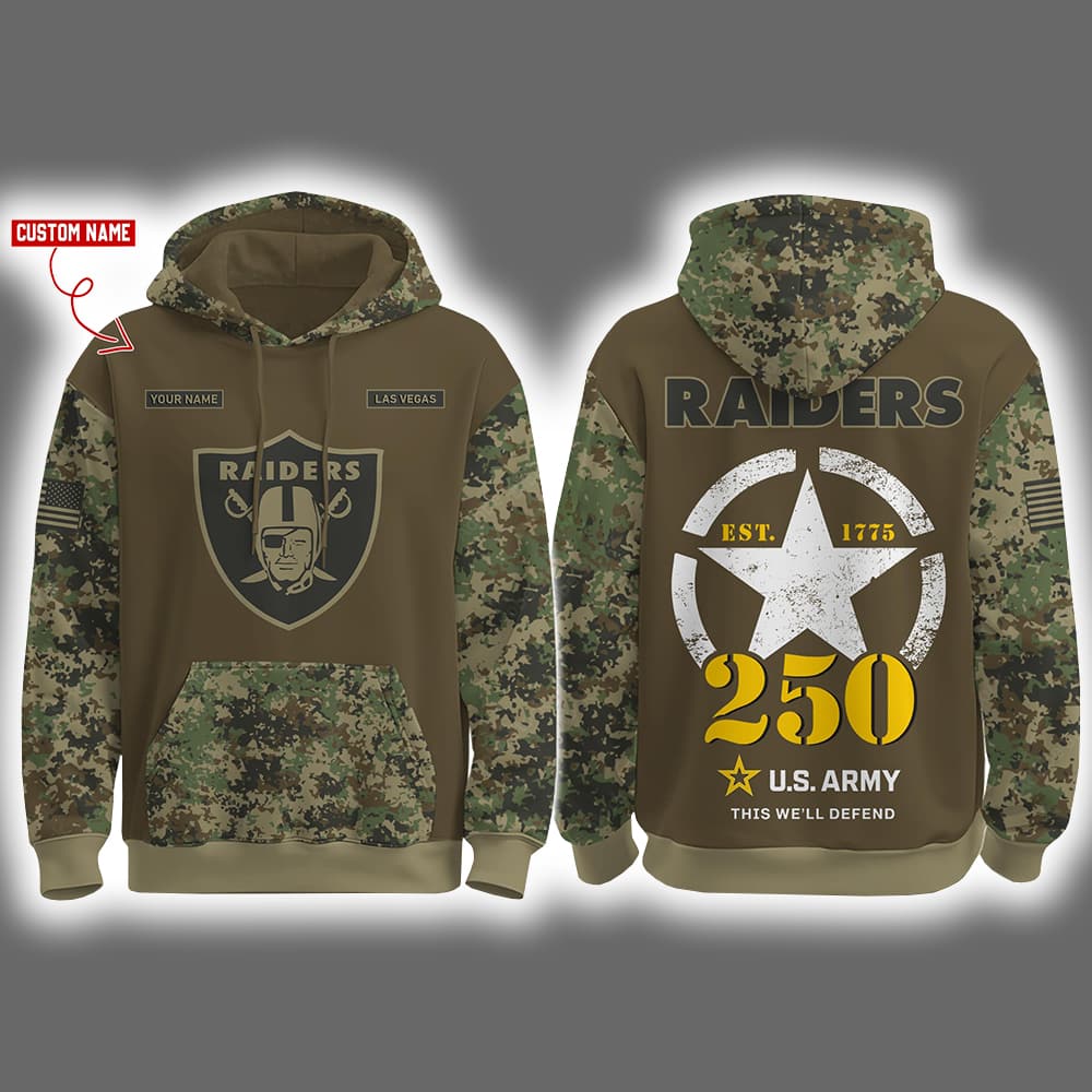 Step into the arena of honor and intensity with the Raiders US Army 250th Birthday Celebration Night Game 2025 Hoodie Joggers Cap. This trio—hoodie, joggers, and cap—is crafted for fans who stand tall and think fierce. The hoodie features a bold Raiders shield emblem with the iconic helmeted figure and crossed swords, set against a rugged olive green base with camouflage sleeves and hood. Above the emblem, two nameplates—“RAIDERS” and “RAIDER”—offer personalization and pride. The left sleeve sports a U.S. flag patch, adding a patriotic edge. On the back, “RAIDERS” dominates the top, followed by a white star marked “EST. 1775,” the golden number “250,” and the powerful motto “U.S. ARMY – THIS WE’LL DEFEND.” The joggers mirror the hoodie’s camo accents and military tones, while the cap completes the look with printed insignia and a starburst that demands respect.