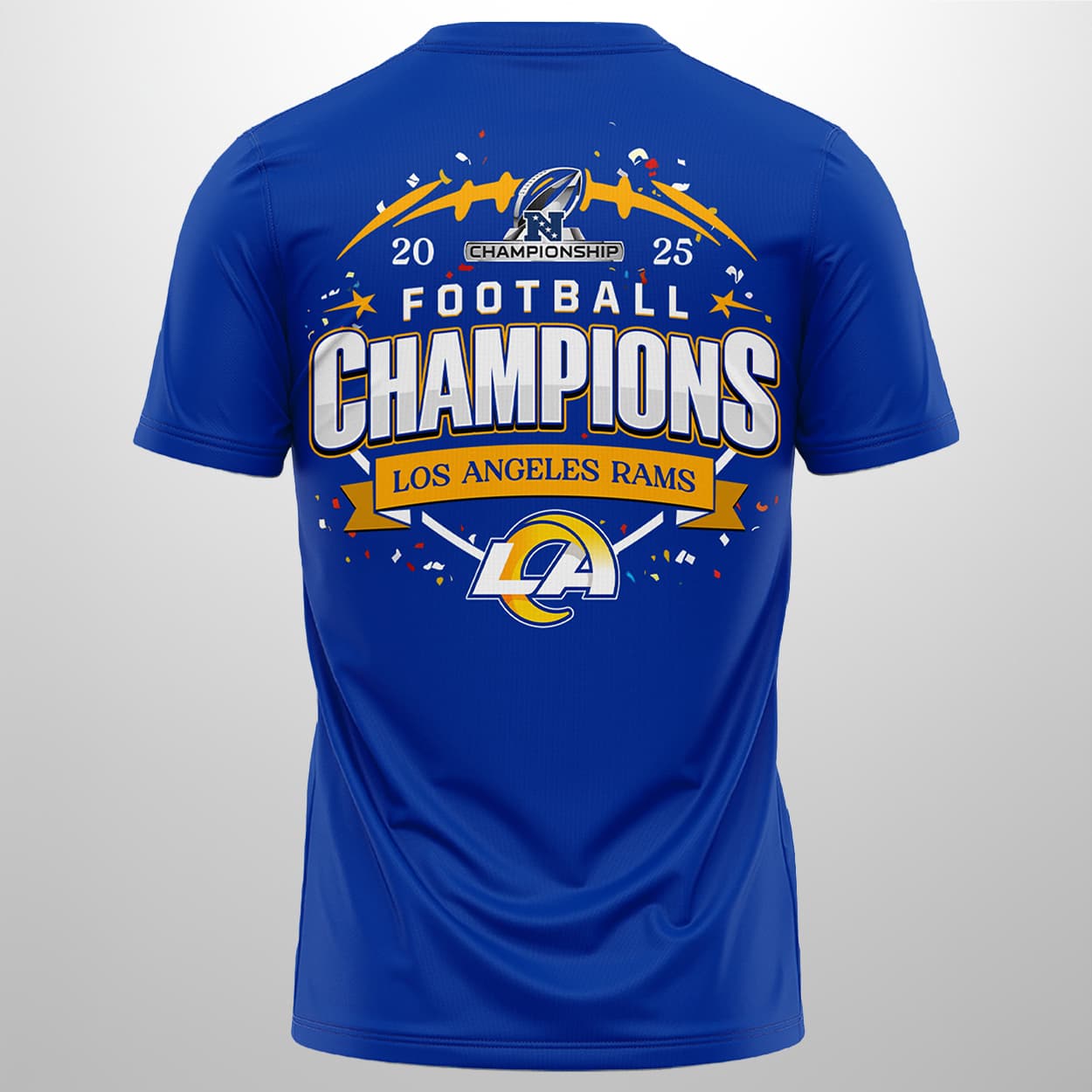 Step into the winner’s circle with this shirt! This vibrant blue tee is a tribute to gridiron greatness, showcasing the Rams’ dominance in style. The front bursts with energy: “2025 NFC CHAMPIONS” crowns the top, followed by a bold “CHAMPIONS” in crisp white, anchored by the iconic Rams logo and “LOS ANGELES RAMS” beneath. Flip it around and the celebration continues—“2025 FOOTBALL CHAMPIONS” explodes across the back in white and yellow, with a yellow banner proudly shouting “LOS ANGELES RAMS.” Stars and paint splashes add a dynamic flair, making this shirt a walking celebration.
