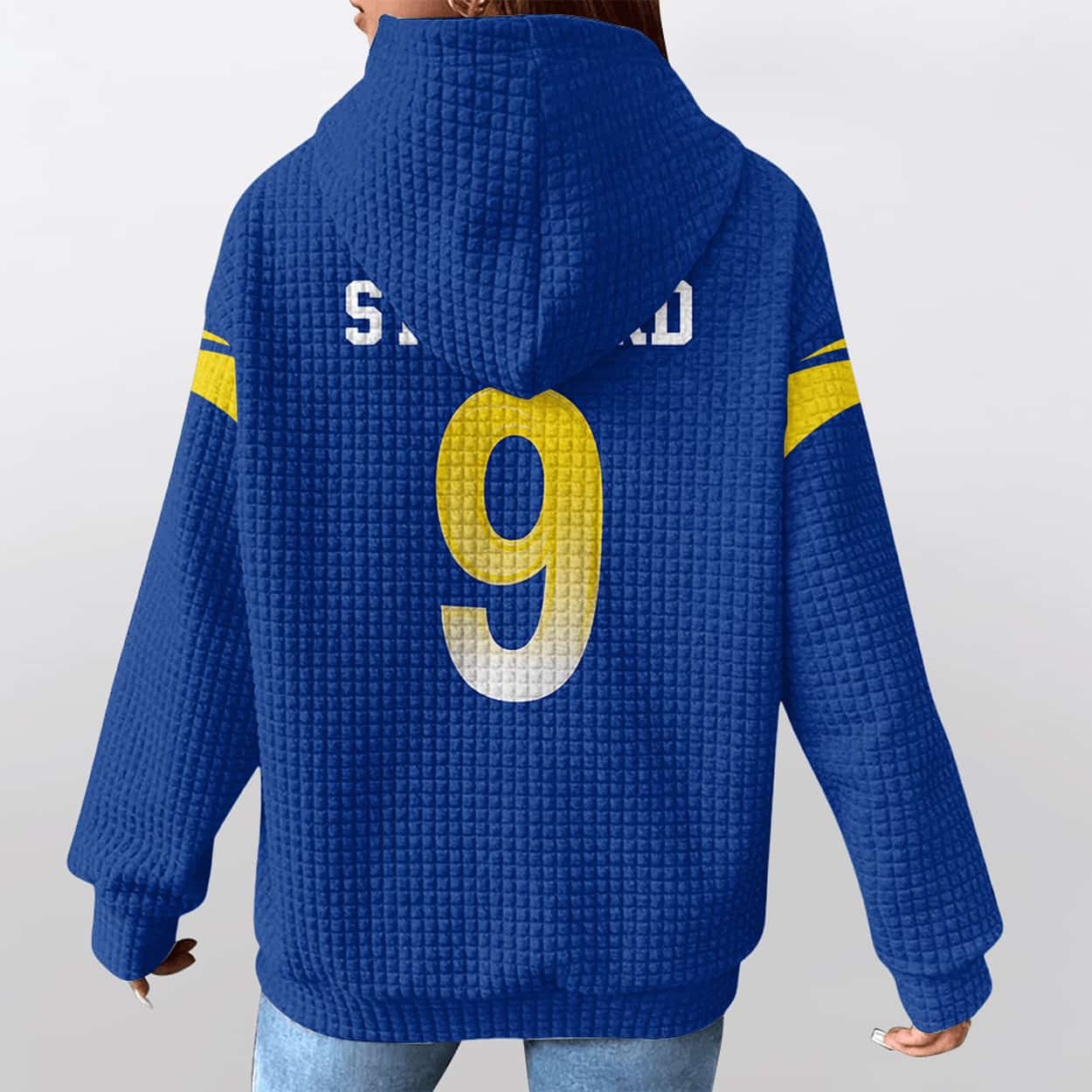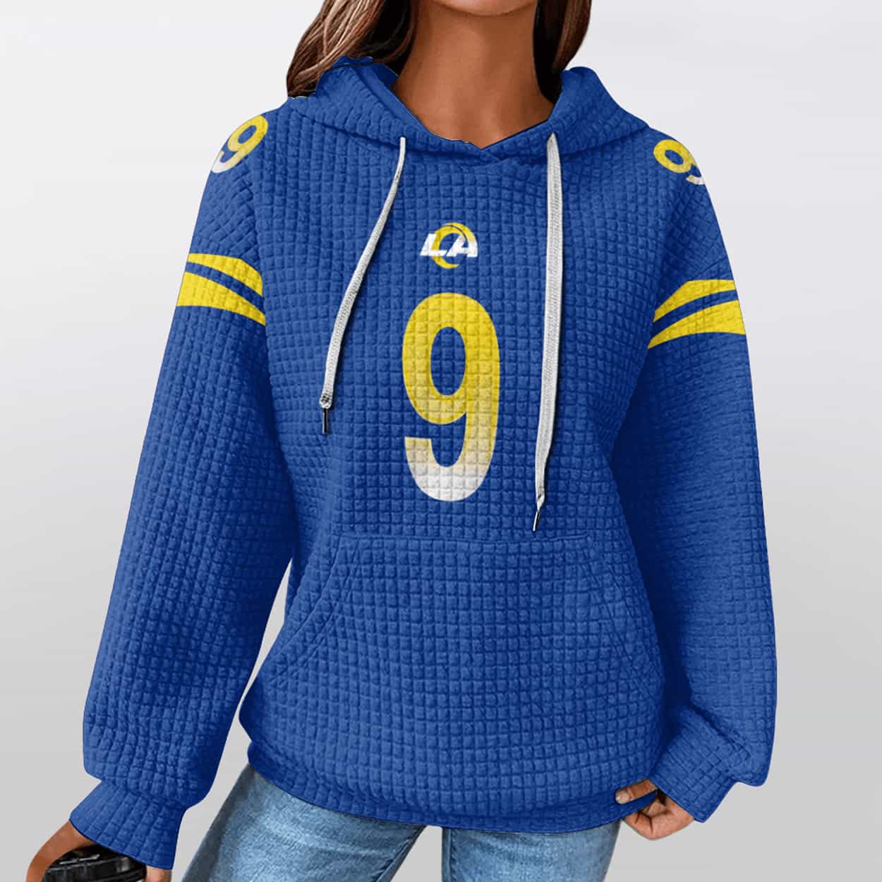 Show off your Rams pride with the Rams Matthew Stafford 9 Waffle Hoodie—a bold, game-day-ready look for fans who lead with grit and golden style.