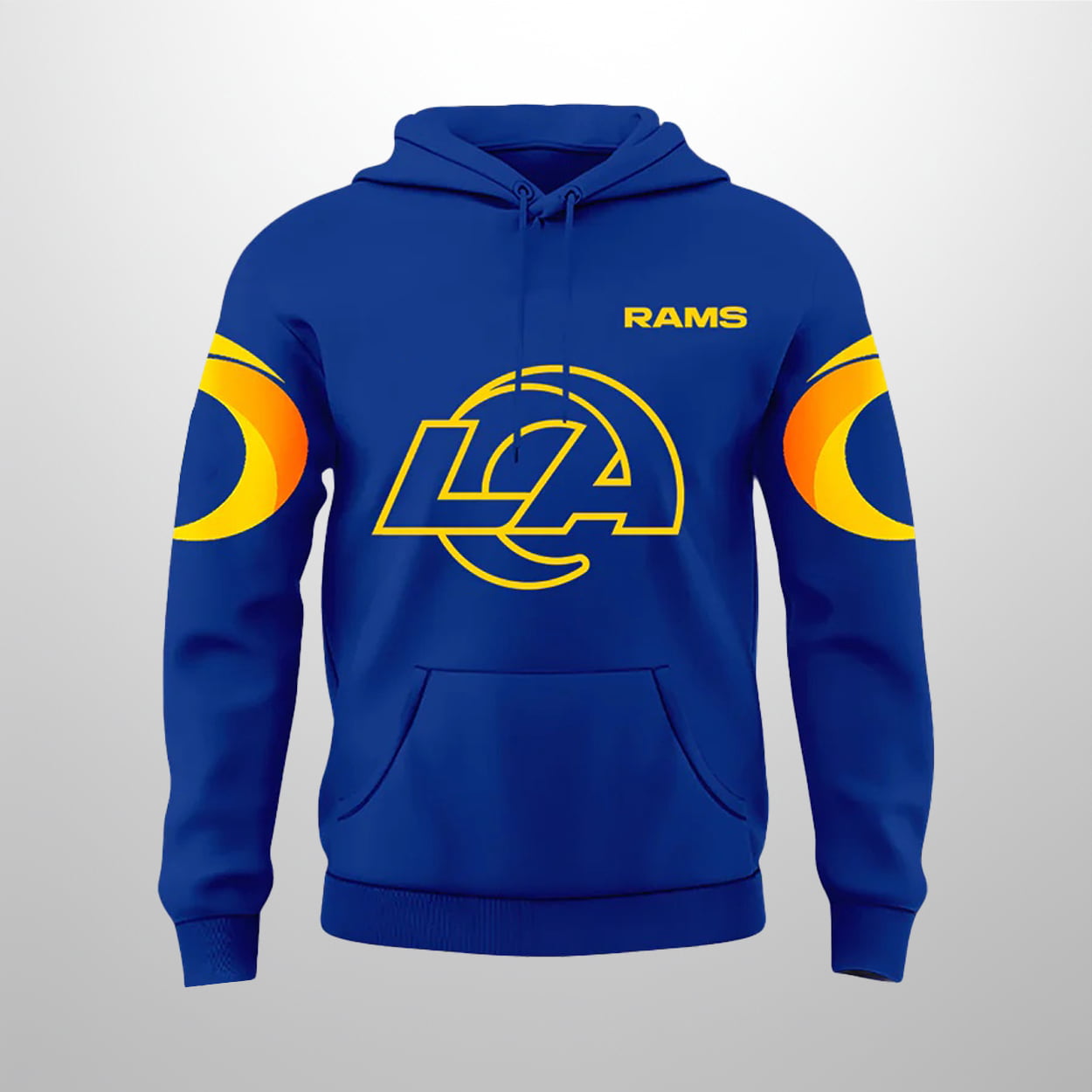 Step into the spotlight with this hoodie, a bold tribute to Los Angeles football dominance. Drenched in deep blue, this hoodie features the iconic Rams logo—stylized “LA” with a charging horn—on both the front and back. The front keeps it sleek with the logo and “RAMS” in bright yellow on the upper chest, while the back goes full throttle with a larger logo and oversized “RAMS” text that demands attention. The sleeves? They’re a showstopper—adorned with yellow and blue horn-like graphics that echo the team’s fierce energy.