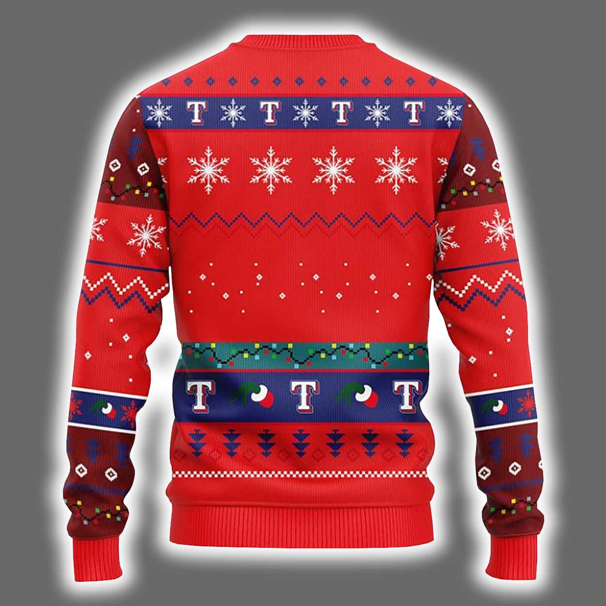 Bring the holiday mischief to your wardrobe with the Rangers 12 Grnch Xmas Day Ugly Christmas Sweater—a festive fusion of baseball pride and Grinchy charm.