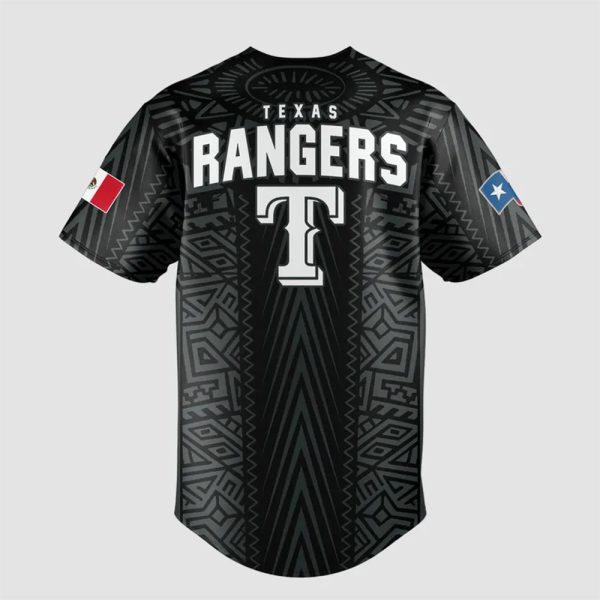 This jersey isn’t just apparel—it’s a celebration of Mexican heritage woven into the heart of Rangers fandom. The intricate black-on-black geometric design draws from traditional Mexican patterns, symbolizing strength and resilience, while the vibrant flags add a pop of color and pride. Designed for the 2025 Mexican Heritage Celebration, it reflects the team’s commitment to inclusivity and cultural appreciation. It’s for the bold thinkers, the fans who embrace their identity and aren’t afraid to stand out in the crowd, whether at Globe Life Field or a local fiesta.