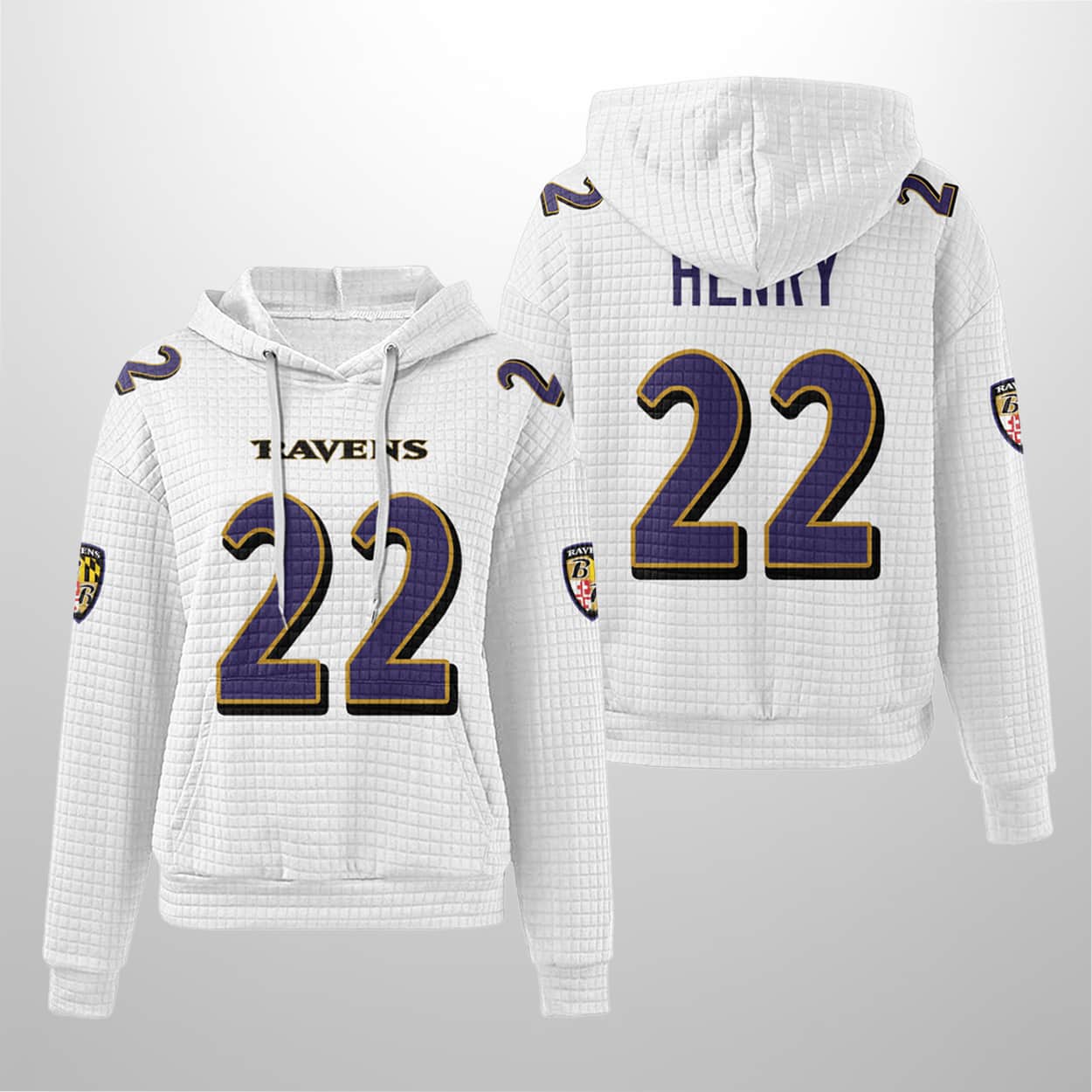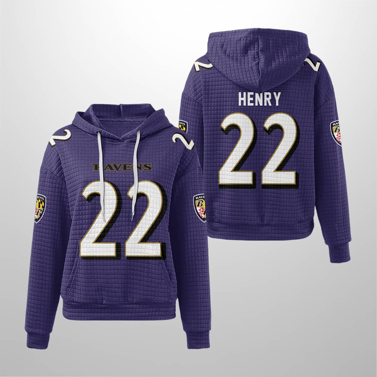 Power up your fan gear with the Ravens Derrick Henry 22 Waffle Hoodie — a bold tribute to strength, swagger, and Baltimore pride.