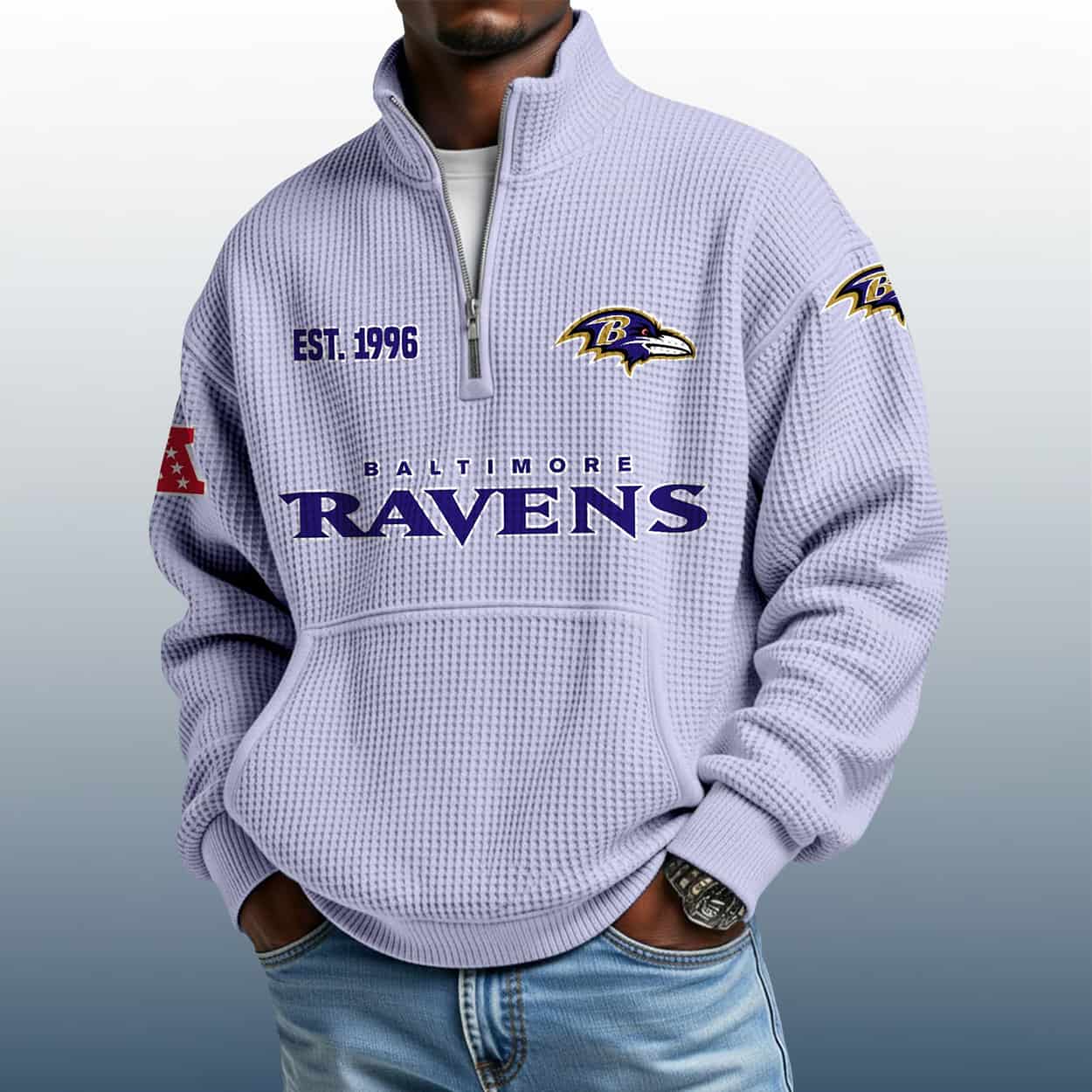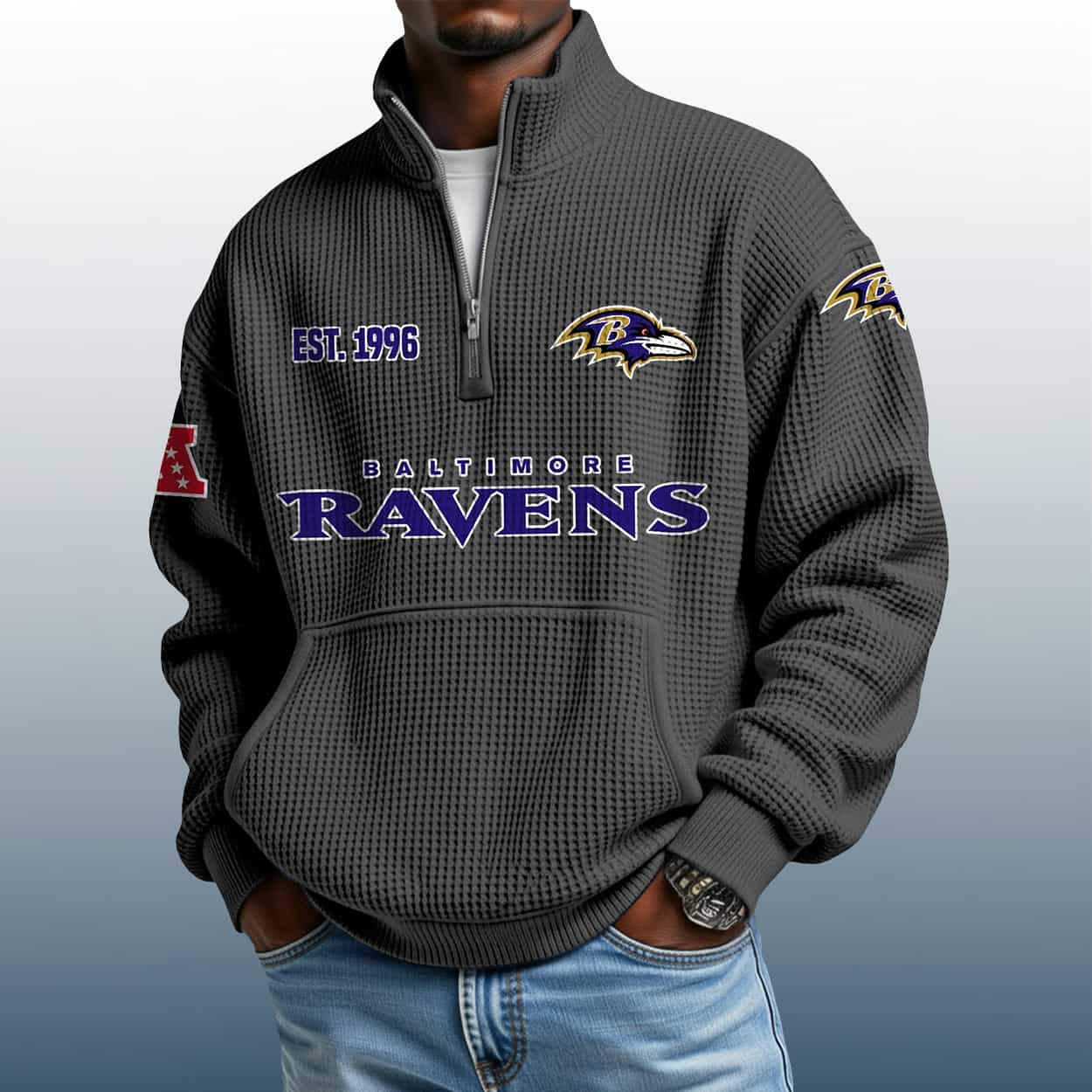Fly fierce with the Ravens Est 1996 Stand Collar Half Zip Waffle Sweatshirt—a bold tribute to Ravens’ football fire. Designed for fans who think sharp and wear their pride loud.