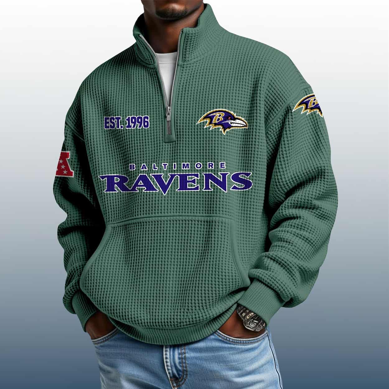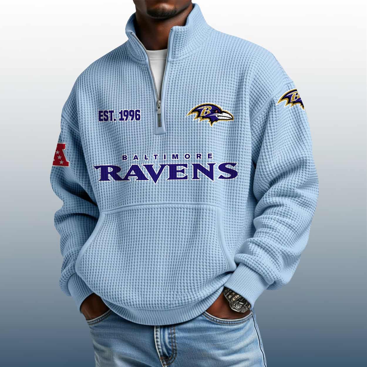 Be the first to review “Ravens Est 1996 Stand Collar Half Zip Waffle Sweatshirt” Cancel reply