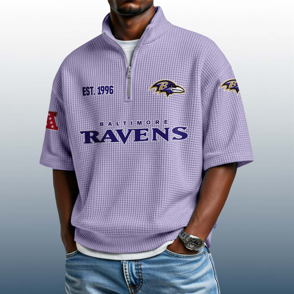 This shirt is your ticket to fan fashion dominance. Drenched in a sleek light purple hue with a textured finish, this shirt is anything but subtle. “RAVENS” stretches across the chest in commanding blue letters, while “EST. 1996” sits proudly on the upper left. The quarter-zip collar brings a sporty edge that’s perfect for game day or any day you want to flex your fandom.