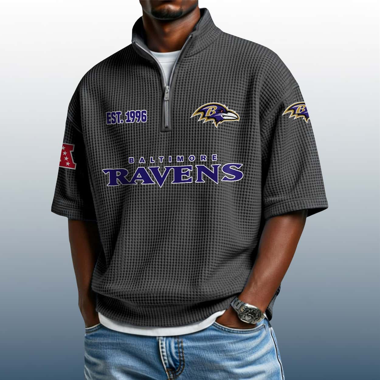 Fly high with the Ravens Est 1996 Waffle Stand Collar Half Zip Polo Shirt—a bold, textured tribute to Baltimore’s fierce football legacy. Stylish, spirited, and built for fans who lead the flock.