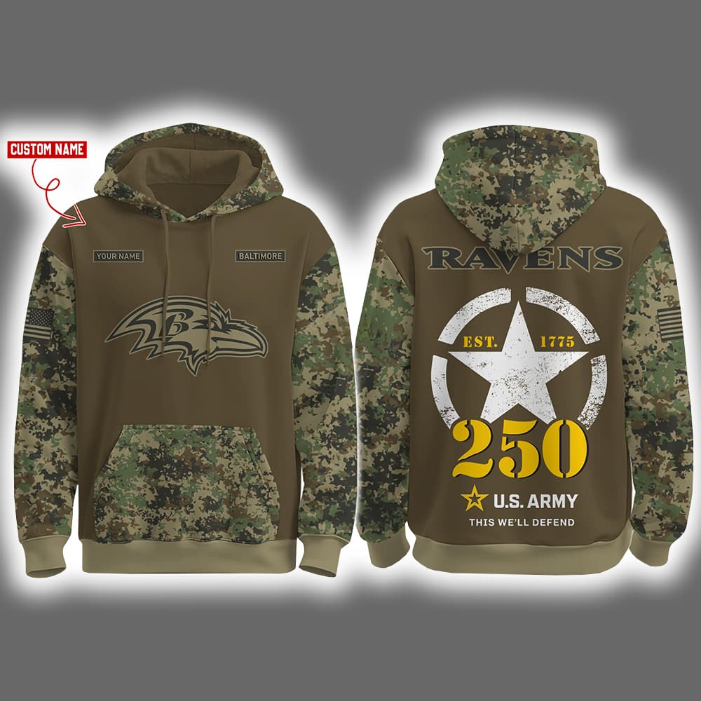 Introducing the Ravens US Army 250th Birthday Celebration Night Game 2025 Hoodie Joggers Cap—a commanding trio of hoodie, joggers, and cap that blends battlefield honor with gridiron swagger. The hoodie features a rugged olive green chest and upper back, contrasted by camouflage sleeves and lower torso. Front and center is the fierce Ravens logo, perched beneath two name tags: “RAVENS” and “VETERAN.” A red-highlighted “CUSTOM NAME” label on the left shoulder lets you personalize your allegiance. On the back, “RAVENS” stands tall above a white star emblem marked “EST. 1775,” with the number “250” in bold yellow. Beneath it, the motto reads: “U.S. ARMY – THIS WE’LL DEFEND.” The joggers echo the hoodie’s military-meets-sports aesthetic, while the cap completes the look with printed insignia and a structured fit that’s ready for action. A U.S. flag patch on the sleeve seals the salute with patriotic pride.
