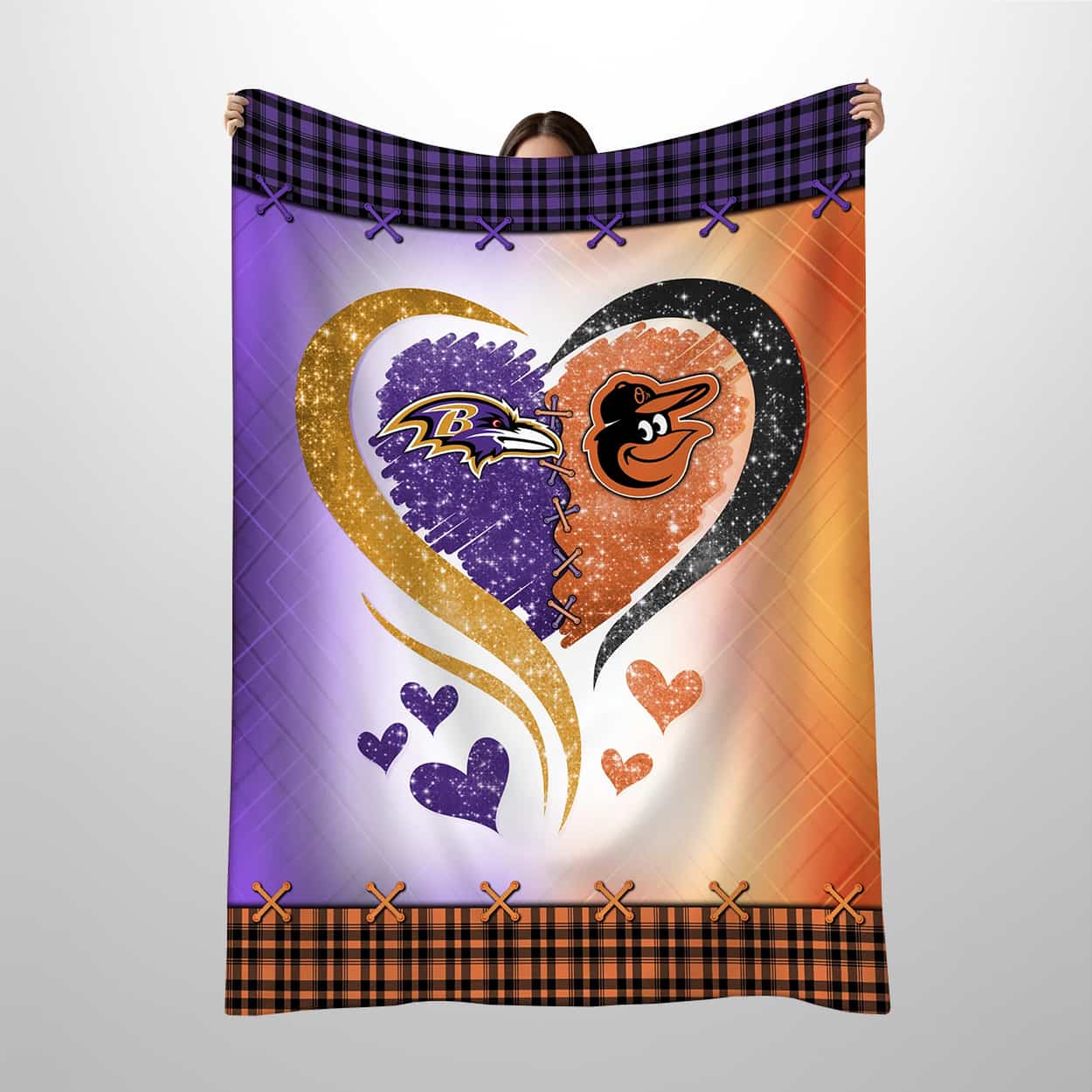 This blanket is a dazzling celebration of Baltimore’s sports culture. At the center, a glittery heart split in two proudly displays the purple Ravens logo on one side and the orange Orioles logo on the other. Smaller hearts in matching team colors surround the centerpiece, adding playful energy to the design. The background flows seamlessly from purple to orange in a striking gradient, while the top and bottom borders feature a bold plaid pattern with crisscross stitching, giving the blanket a unique finishing touch. It’s a visual anthem for fans who cheer loud and love harder.