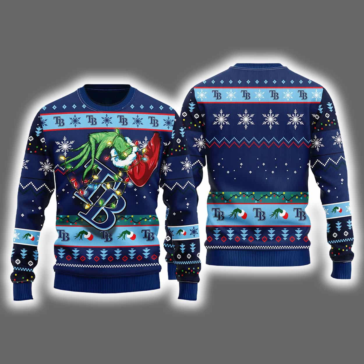 This sweater is a holiday home run for Tampa Bay Rays fans who love to mix team spirit with seasonal sass. Set against a deep navy blue backdrop, the front features the iconic Grinch in full scheming mode, clutching a red Christmas ornament that proudly displays the Rays’ “TB” logo. Snowflakes, stars, candy canes, and holly leaves swirl around the design, creating a festive frenzy that stretches across the sleeves and lower hem. The back keeps the celebration going with symmetrical bands of snowflakes and “TB” logos, making sure your fandom shines from every angle.