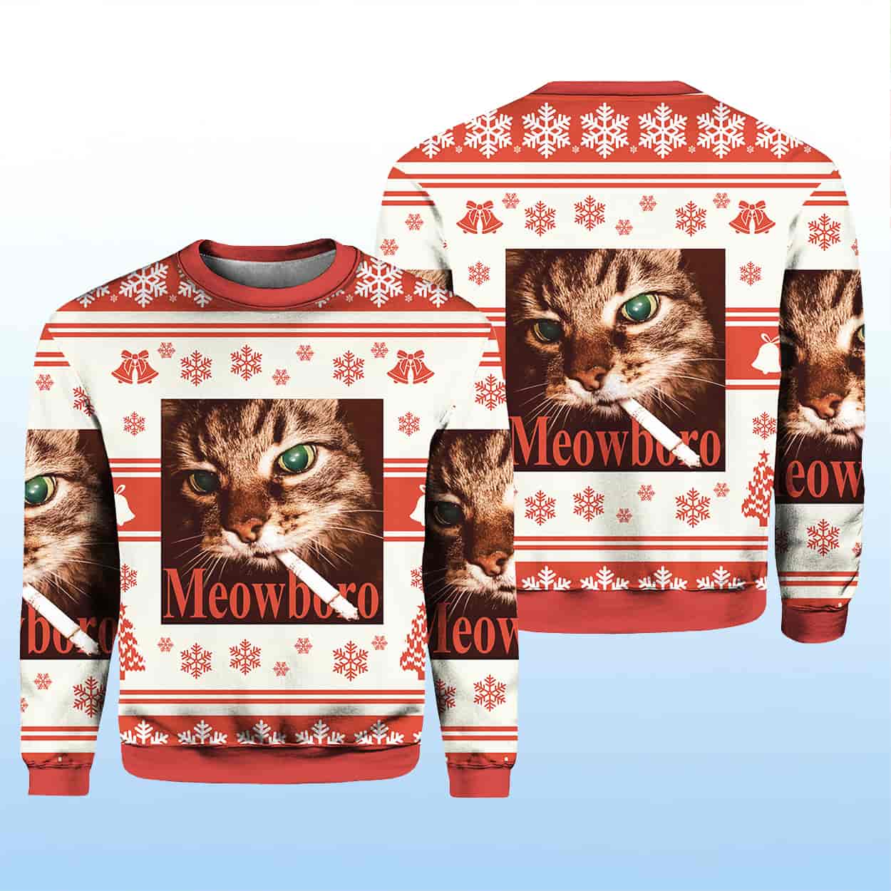 Make way for the most gloriously rebellious holiday sweater of the season. This sweater features a bold, front-and-back image of a green-eyed tabby cat staring down the holidays with cool indifference. Beneath this majestic feline, the word “Meowboco” pops in bold red letters, adding a cheeky twist to the design. Wrapped in festive red and white, the sweater is adorned with snowflakes, ribbon patterns, and symmetrical holiday motifs that contrast hilariously with the cat’s unbothered vibe. It’s the ultimate mashup of seasonal spirit and feline sass.