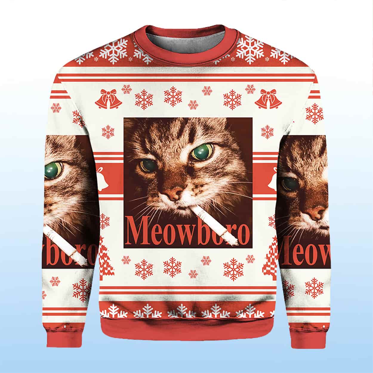 Ready to claw your way into holiday legend? Slip into the Red Meowlboro Smoking Cat Christmas Ugly Sweater and let your festive feline energy take center stage!