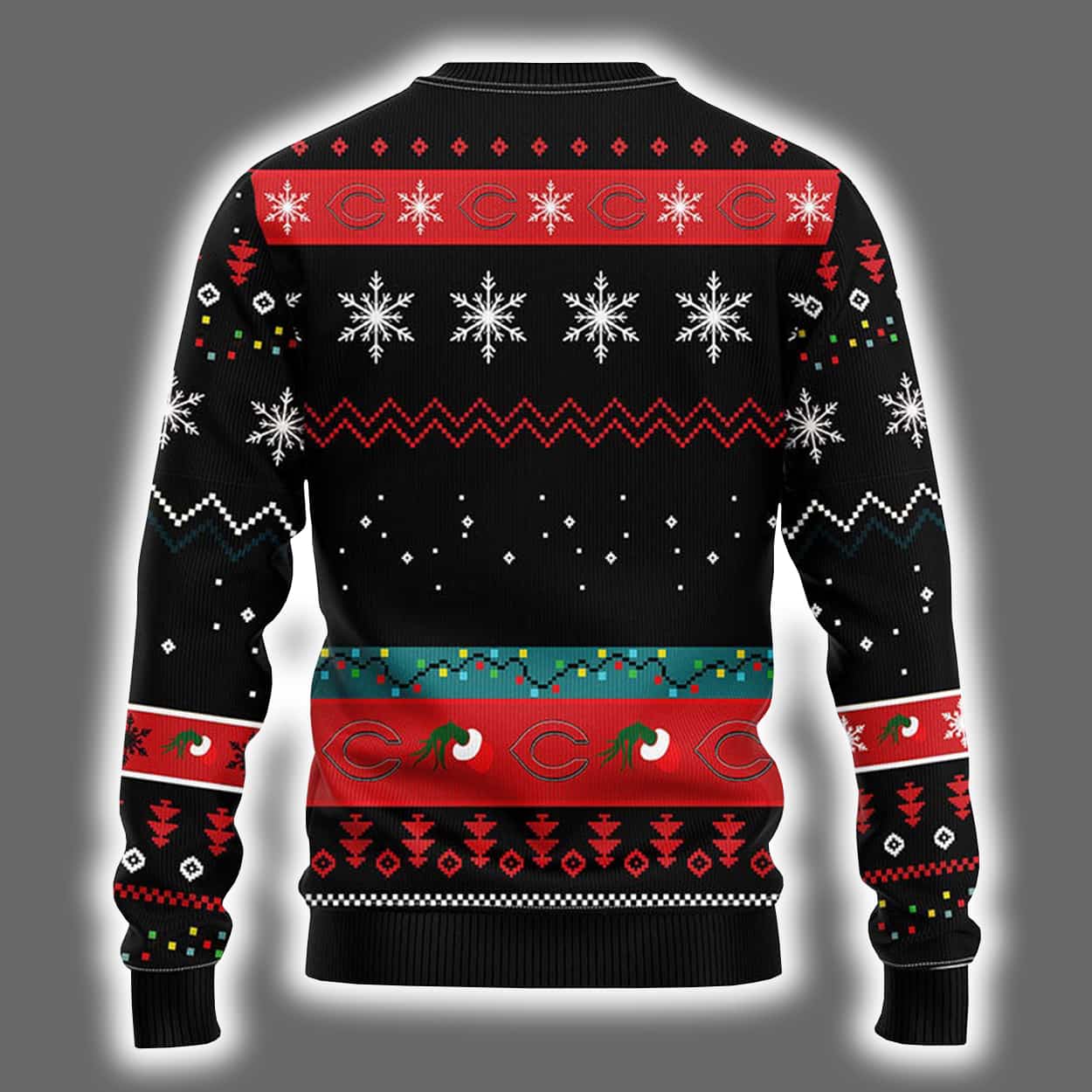 This sweater is a festive fastball straight to the heart of holiday fun. With a bold black base and eye-catching red and green accents, it’s impossible to ignore. Front and center, the Grinch—sporting his classic Santa suit and signature smirk—holds a large red “C” pays tribute to the Cincinnati Reds, blending holiday spirit with hometown pride. Snowflakes, stars, and decorative patterns swirl across the front in white, red, and green, while the back keeps the celebration going with a flurry of festive motifs.
