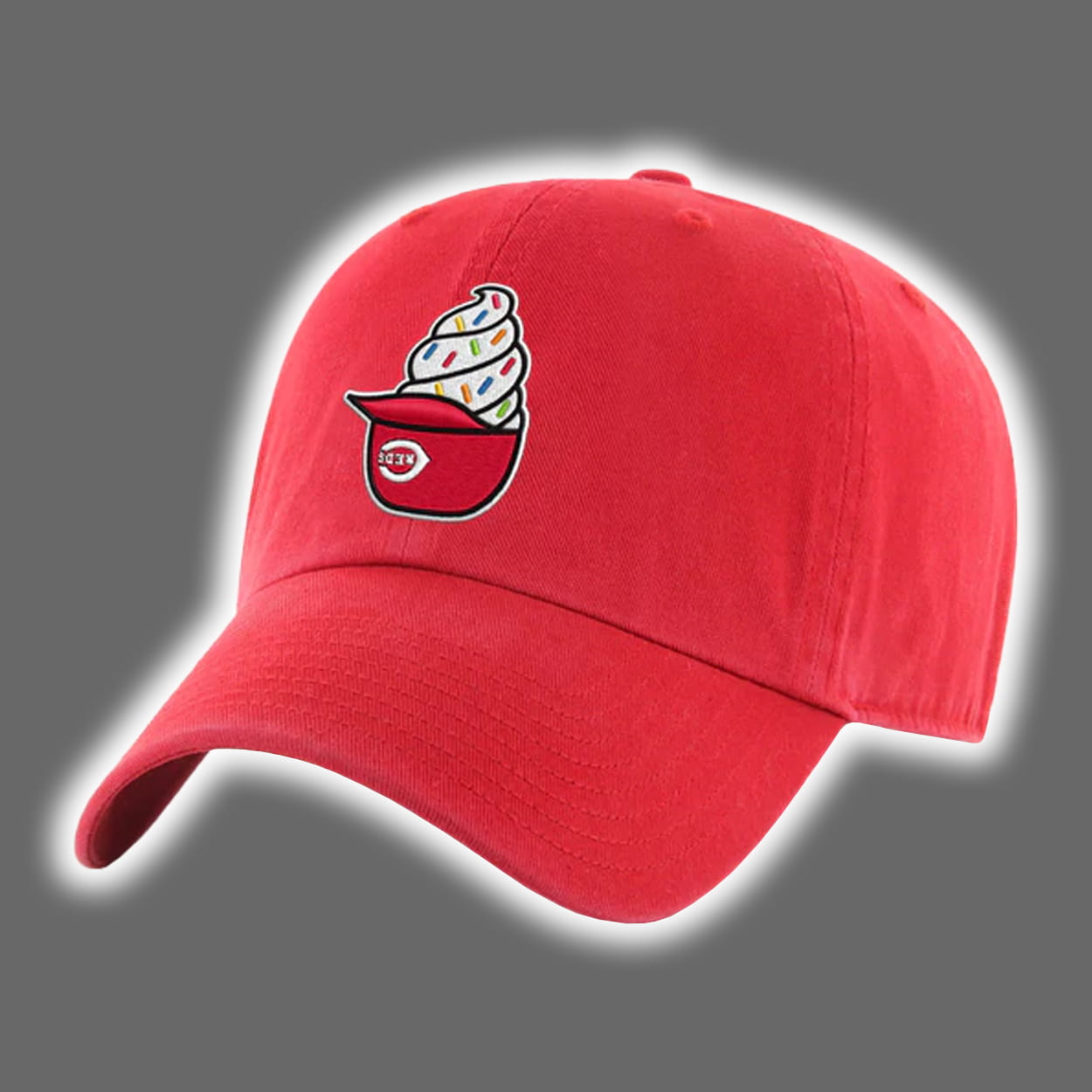 Step up your style game with this hat, a cap that’s as bold as your fandom. This vibrant red baseball cap features an embroidered design of a swirled soft-serve ice cream topped with rainbow sprinkles, all nestled inside a stylized bowl that doubles as a miniature Reds batting helmet. Front and center is the iconic Cincinnati Reds “C” logo, cleverly integrated into the bowl’s design. It’s playful, eye-catching, and unmistakably team-spirited—perfect for game day or any day you want to show off your love for baseball with a scoop of personality.