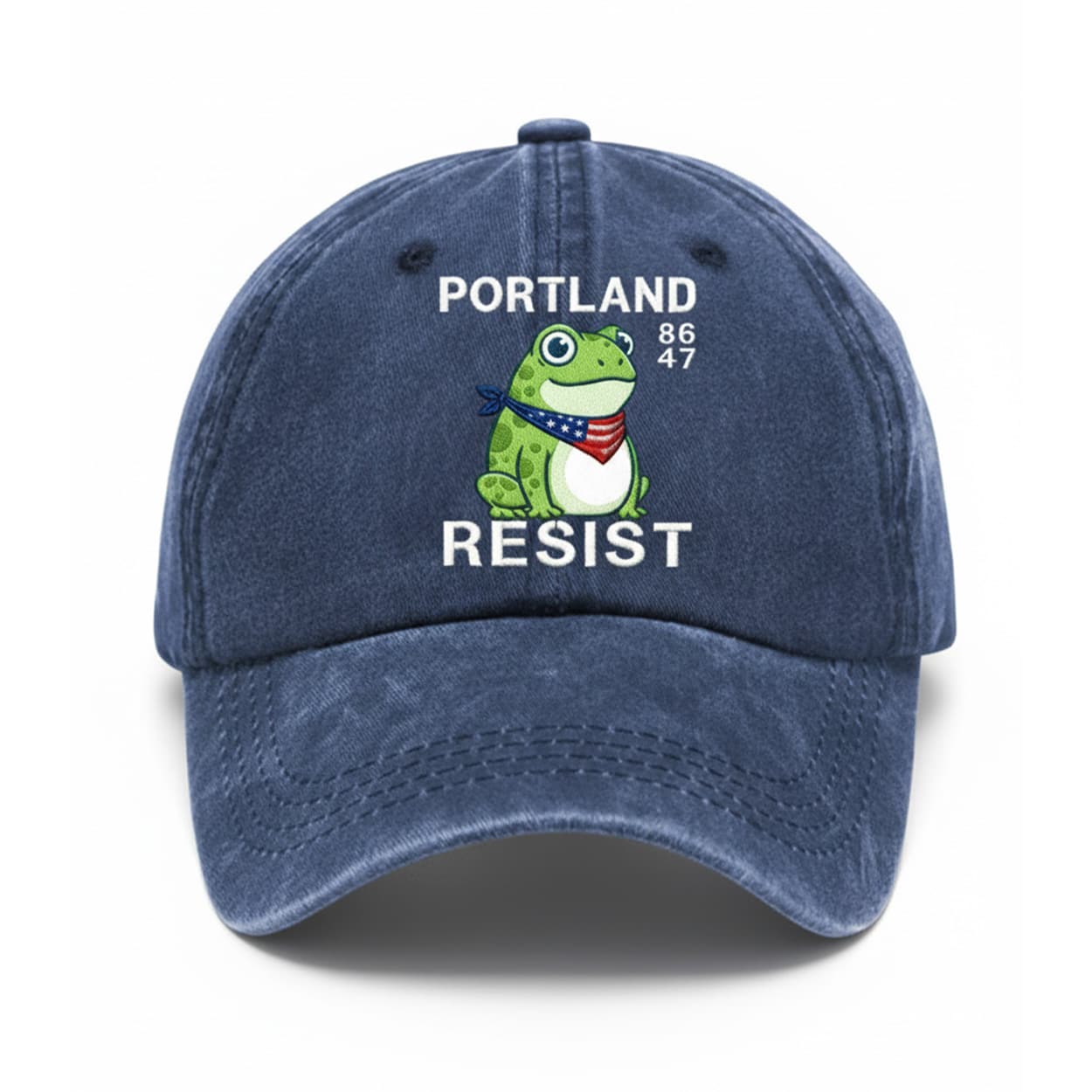 Top off your look with this hat, a denim-blue cap that’s as bold as it is whimsical. Front and center is a cartoon frog decked out in a red, white, and blue bandana, standing proud like a tiny amphibian patriot. Above the frog, the word “PORTLAND” sits prominently, flanked by the numbers “86” and “47”—a cryptic nod that invites curiosity. Below, the word “RESIST” makes the message clear: this hat isn’t just fashion, it’s a statement. With its soft, worn-in texture and vintage vibe, it’s perfect for everyday wear with a rebellious twist.