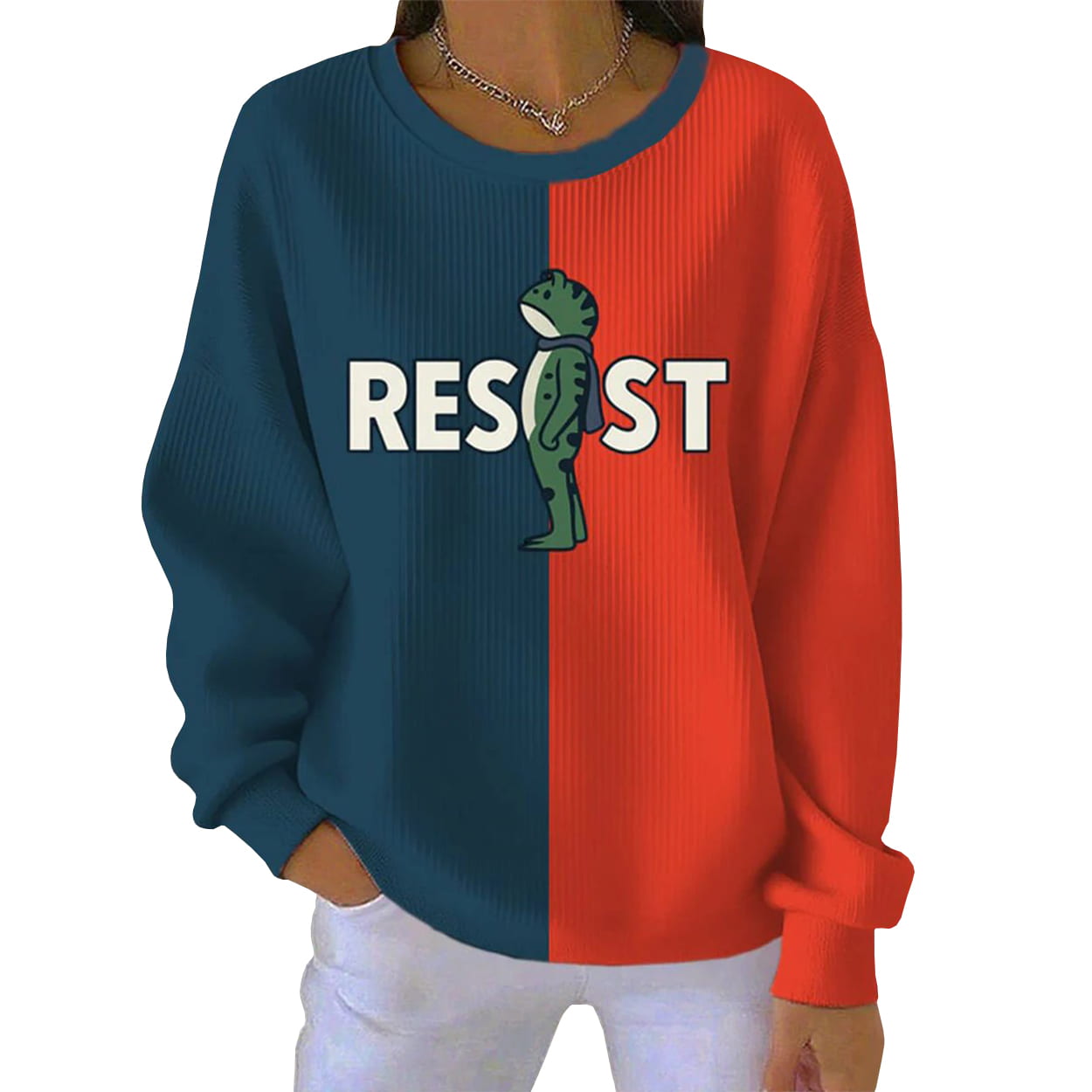 Turn heads and spark conversations with this sweatshirt. This eye-catching piece features a striking vertical split—deep navy on one side, fiery red on the other—creating a visual tension that mirrors the message it carries. Front and center, a cheeky green cartoon frog stands upright, confidently facing right, nestled between bold white letters spelling out “RESIST.” The frog’s placement between the “S” and “I” adds a playful twist to the powerful word, making this sweatshirt both a fashion statement and a conversation starter.