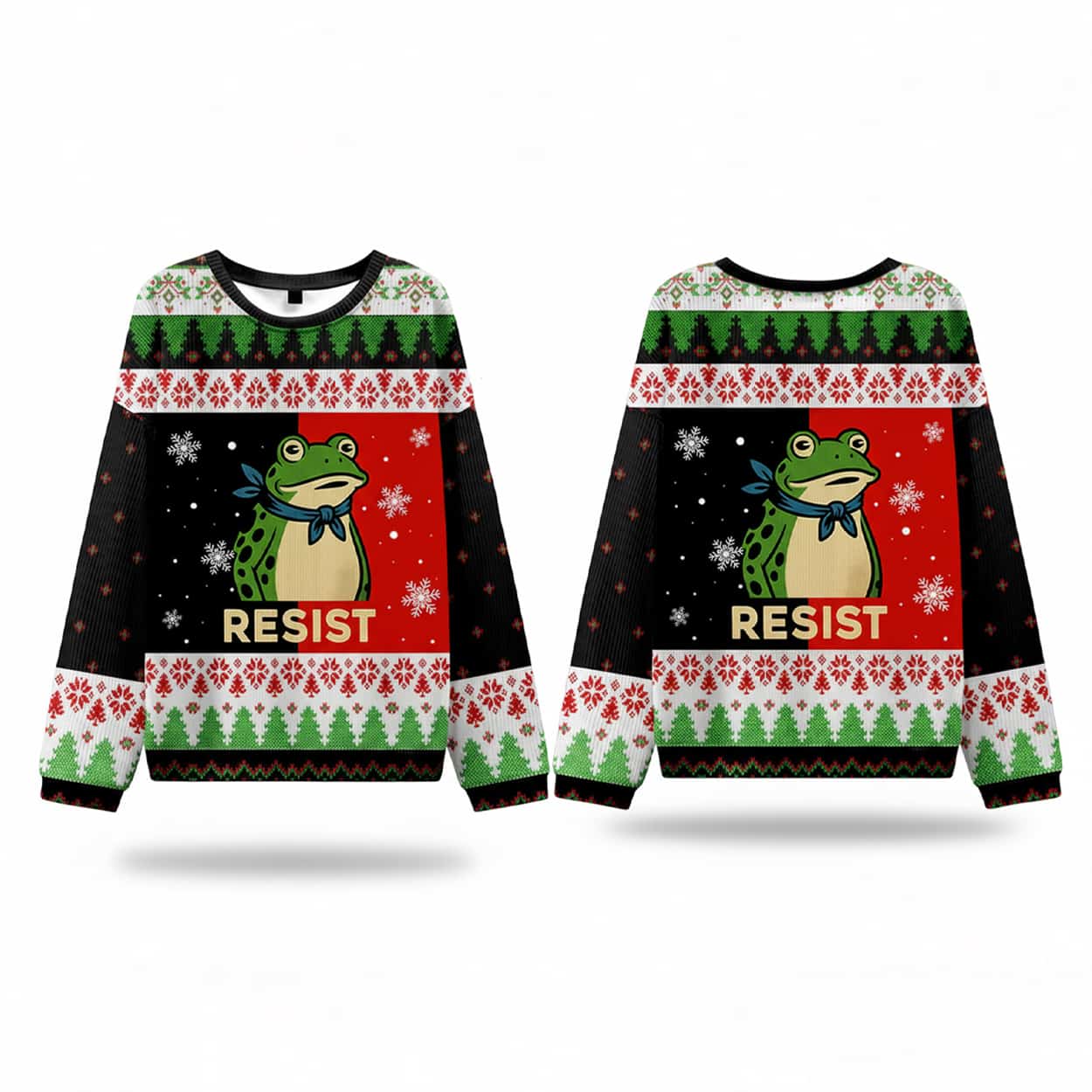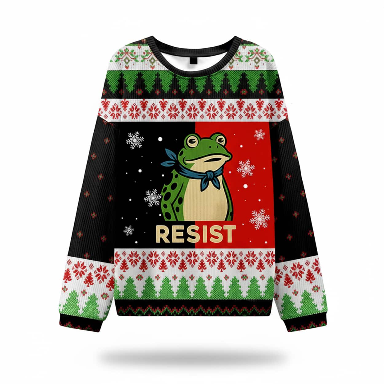 Deck the halls—and the streets—with this eye-catching holiday sweater featuring the unmistakable Portland Frog. Set against a backdrop of red, green, white, and black, the design showcases a determined cartoon frog surrounded by snowflakes, trees, and geometric patterns. Beneath the frog, the word “RESIST” stands loud and proud in bold capital letters, turning this cozy knit into a wearable rallying cry. It’s festive, it’s fierce, and it’s ready to make a statement at any gathering.