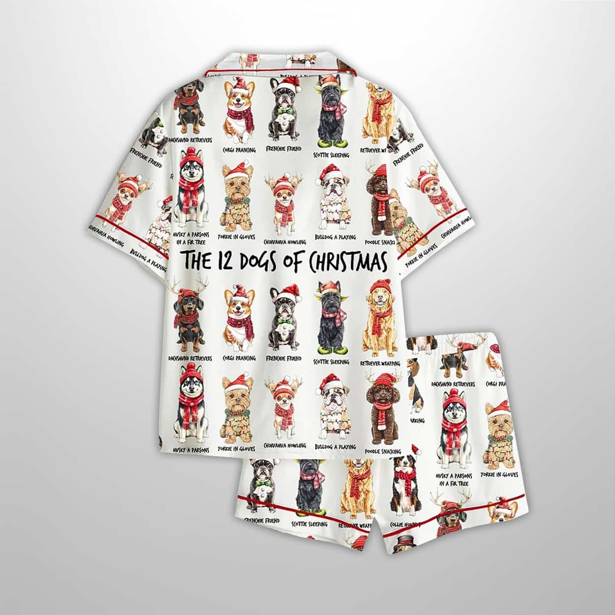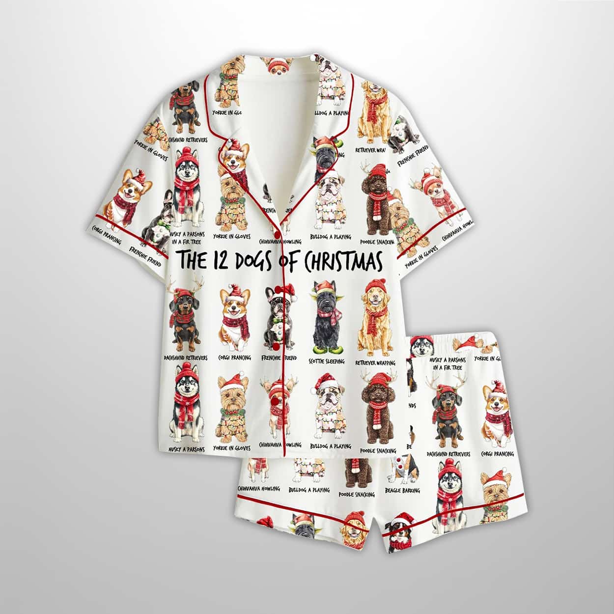 Celebrate the holidays with the Retro 12 Dogs Of Christmas Dog Lover Satin Pajama Set—a joyful, witty sleepwear ensemble that brings festive charm and canine cuteness to your cozy nights.