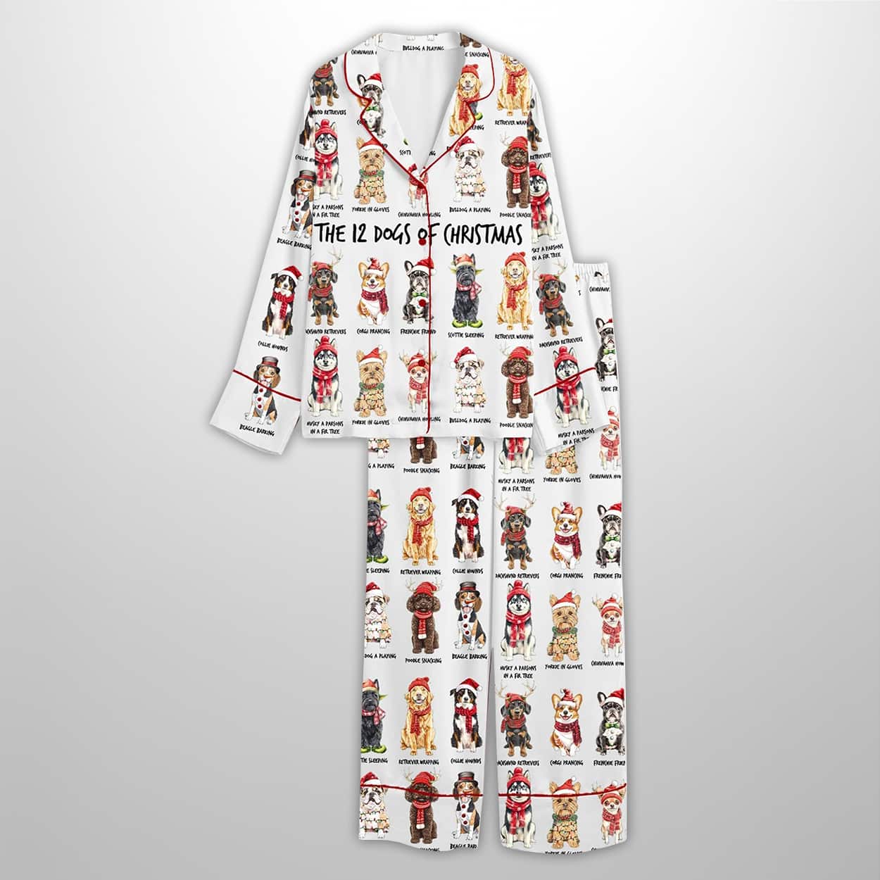 Paws & Puns: The Retro 12 Dogs Of Christmas Dog Lover Satin Pajama Set That Sleighs in Style