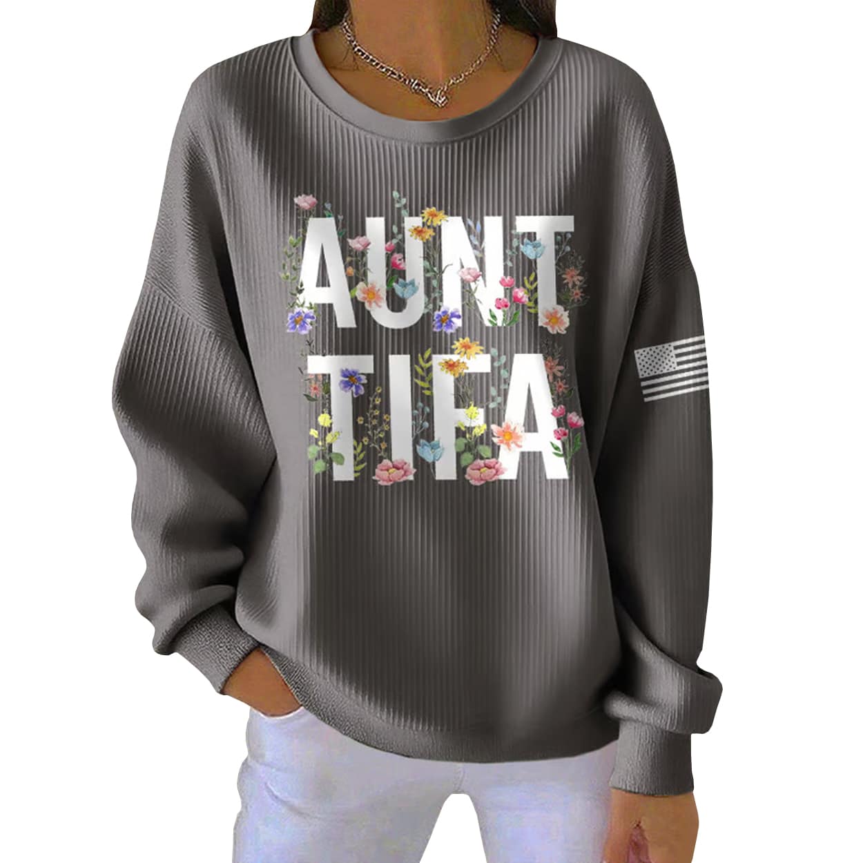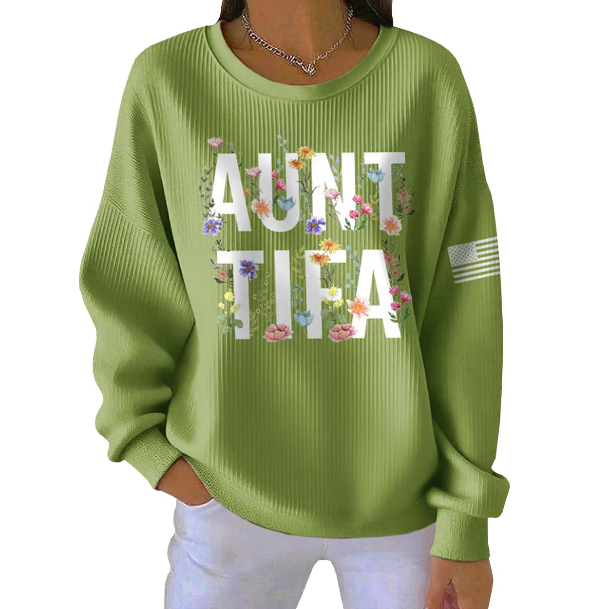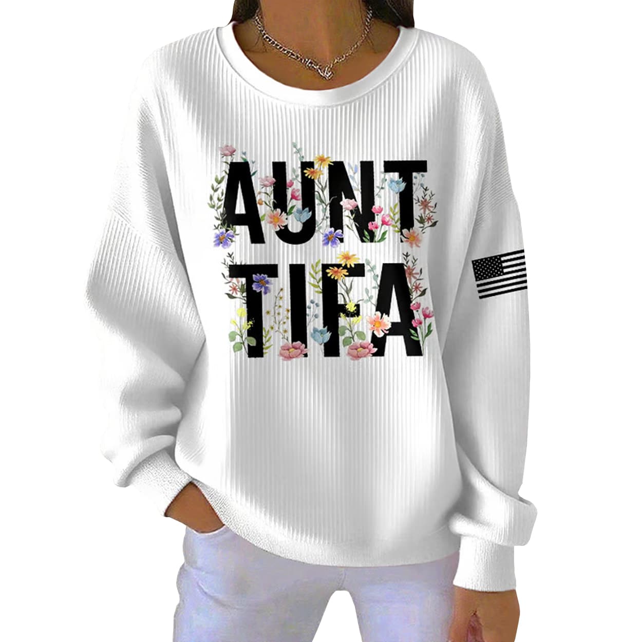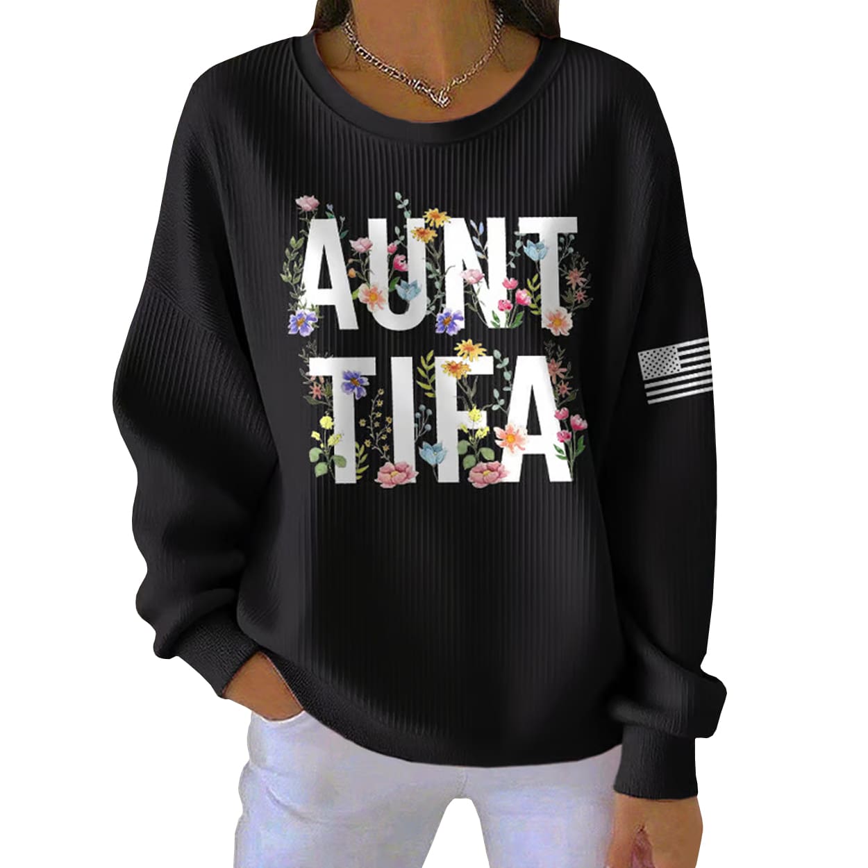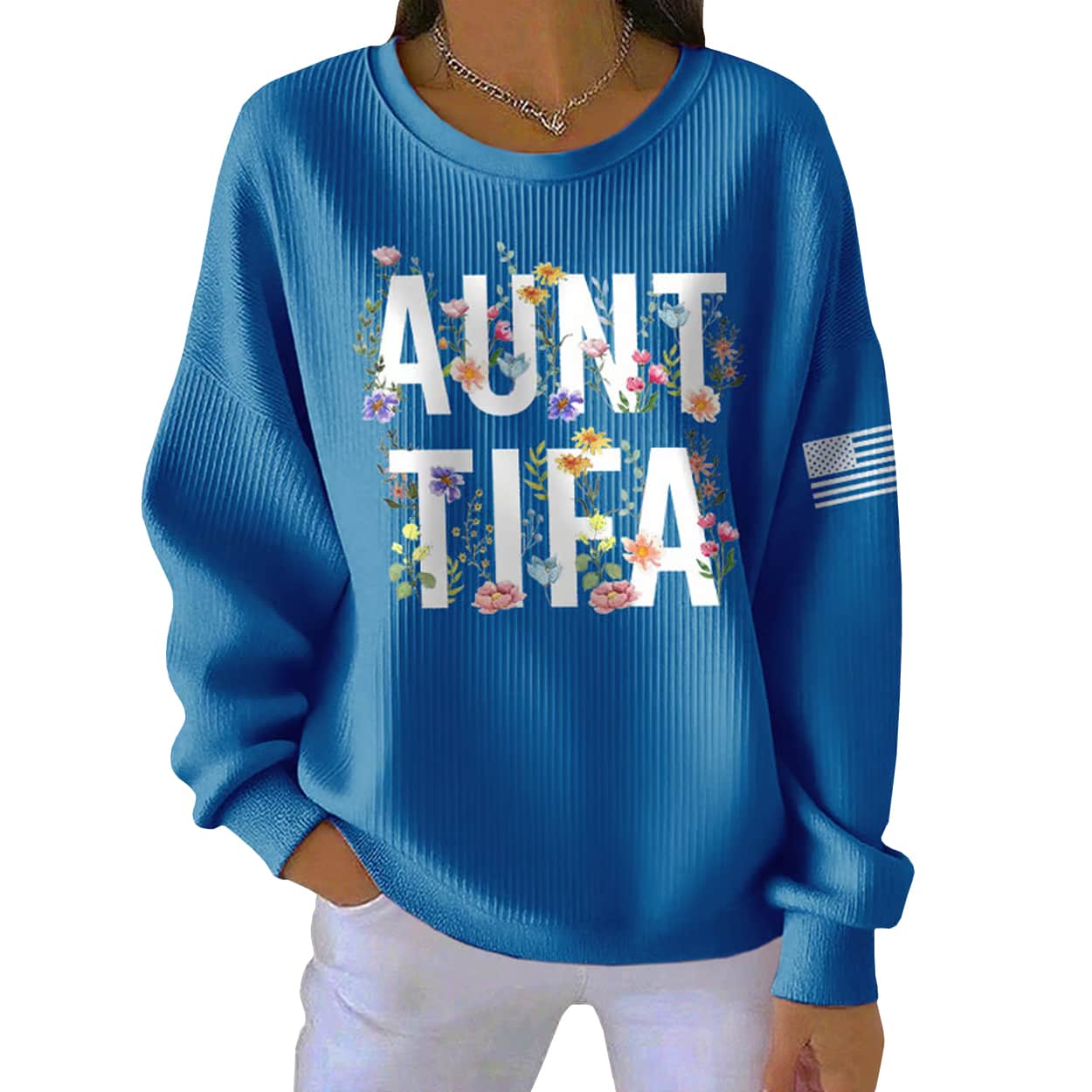 This sweatshirt is where comfort meets charisma. This ribbed blue pullover features the phrase “AUNT TIFA” in large white block letters, each letter blooming with colorful floral accents. A subtle white-striped detail on the left sleeve adds a sporty edge, while the overall vibe is equal parts playful and powerful. Whether you’re lounging or leading a march, this sweatshirt makes a statement without saying a word.