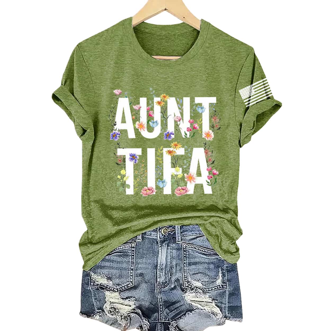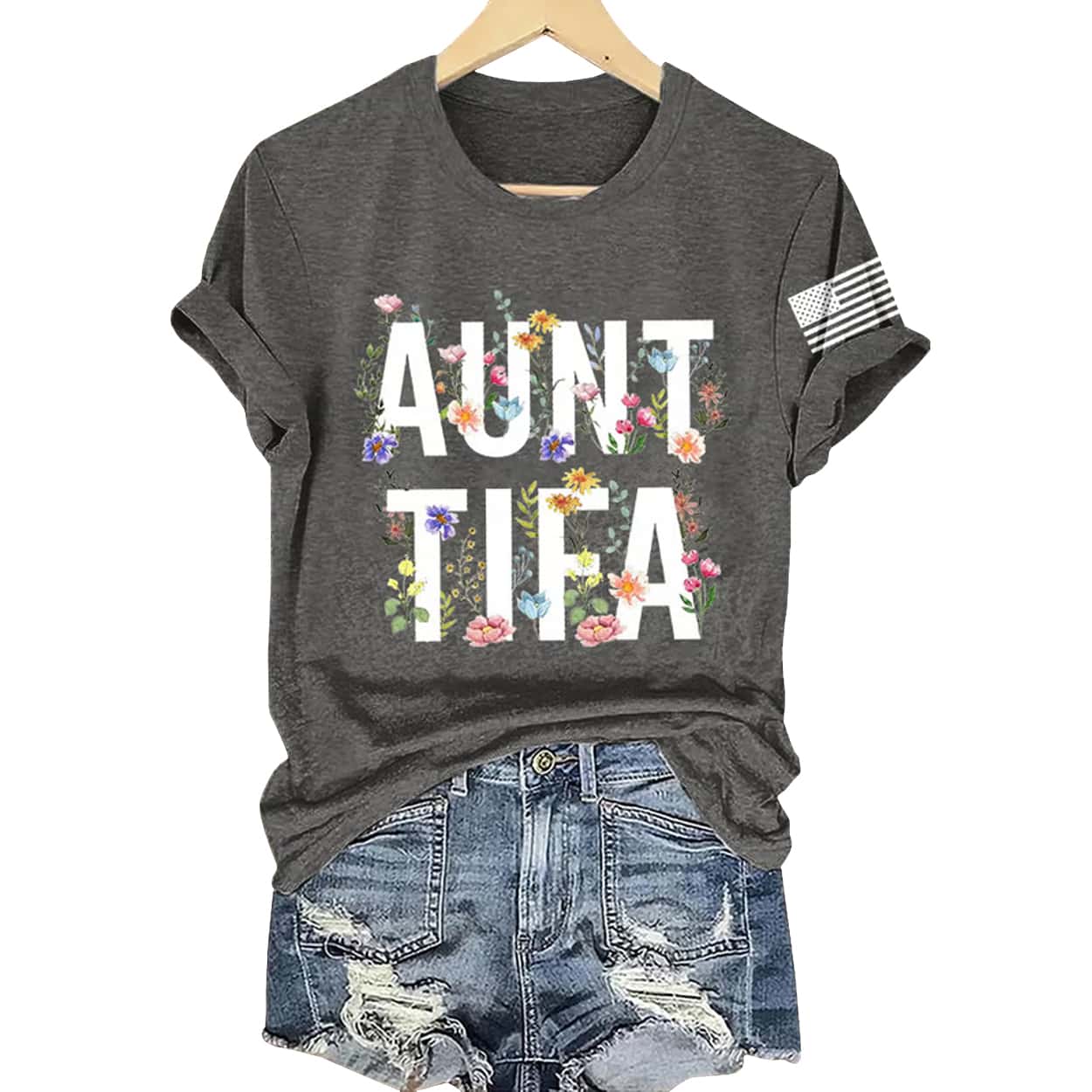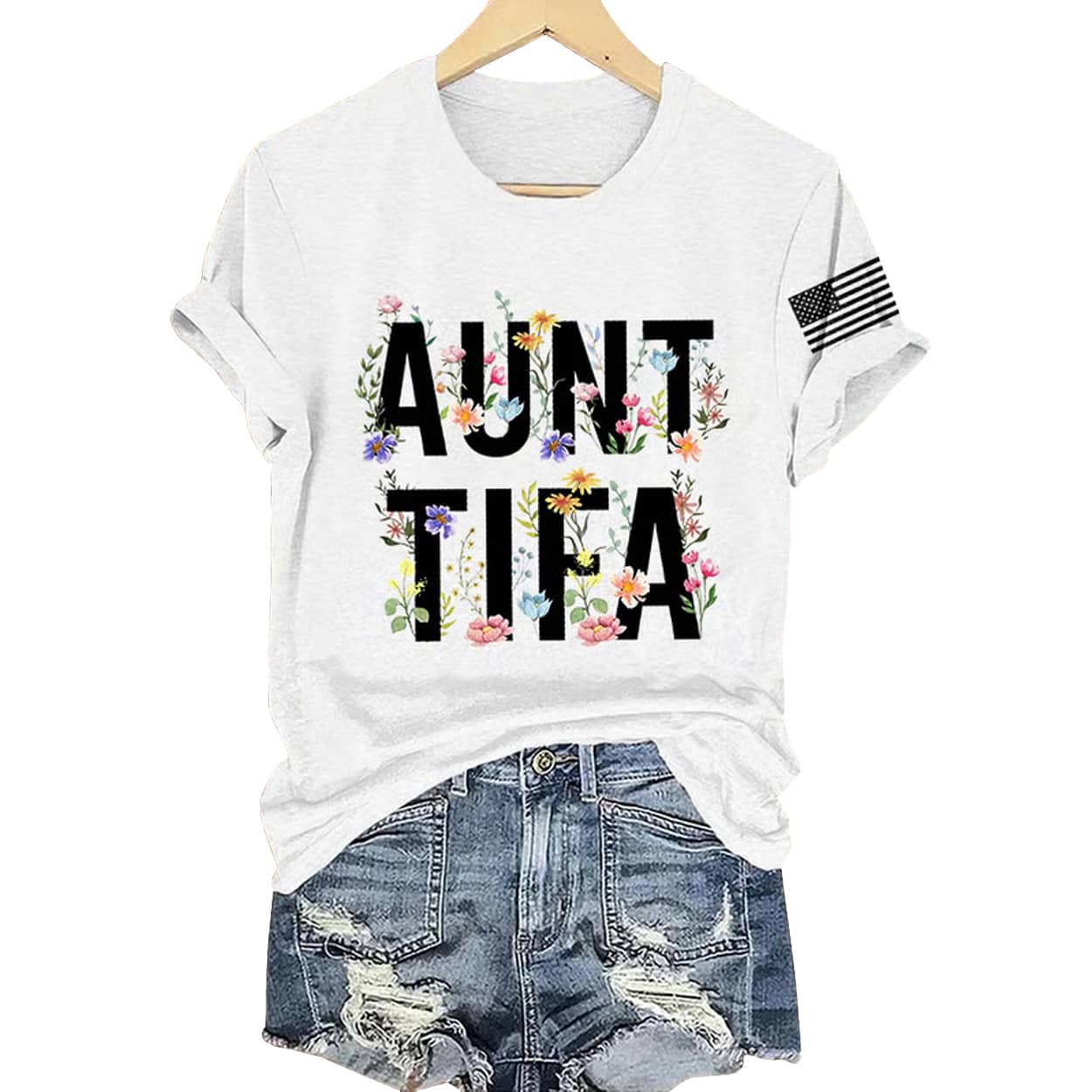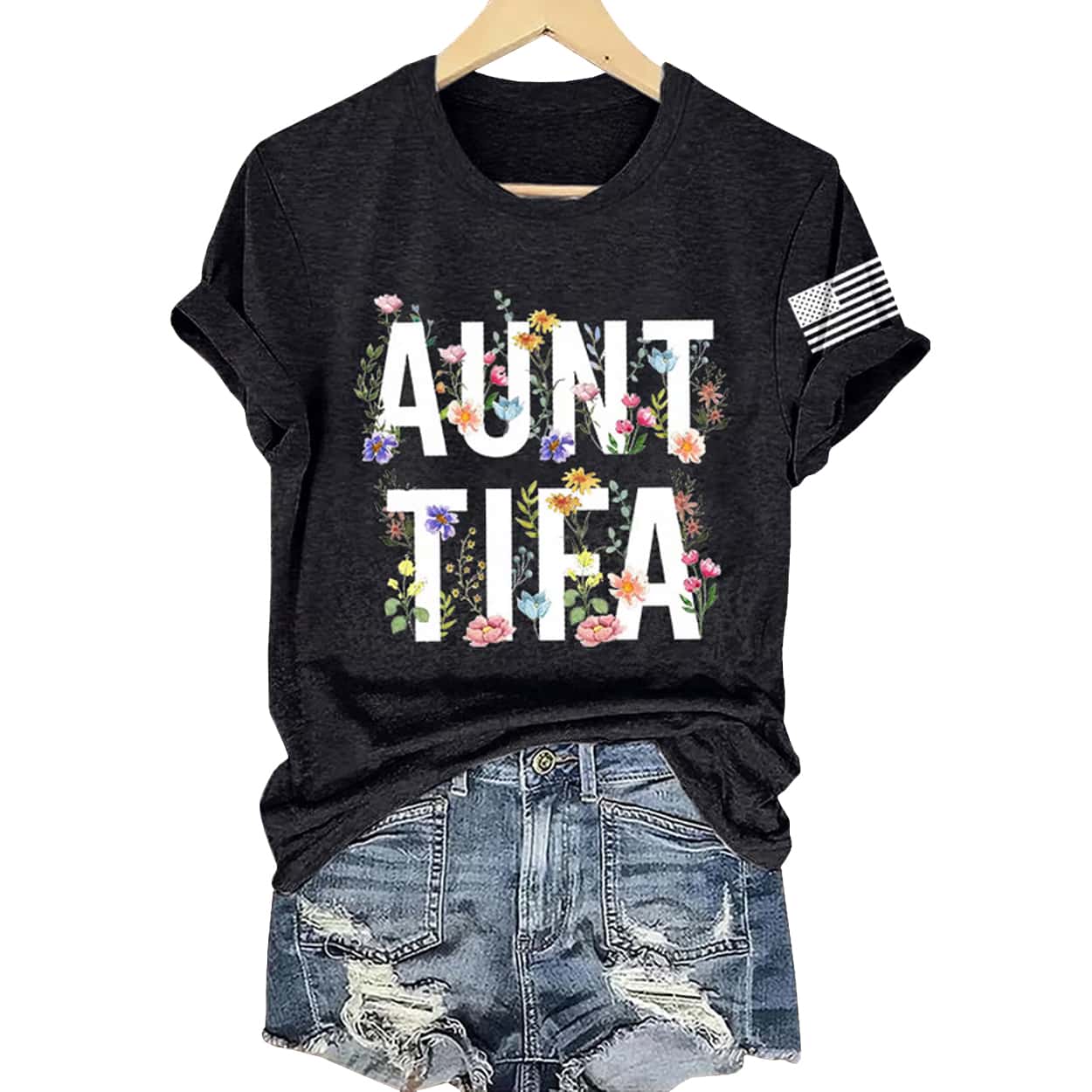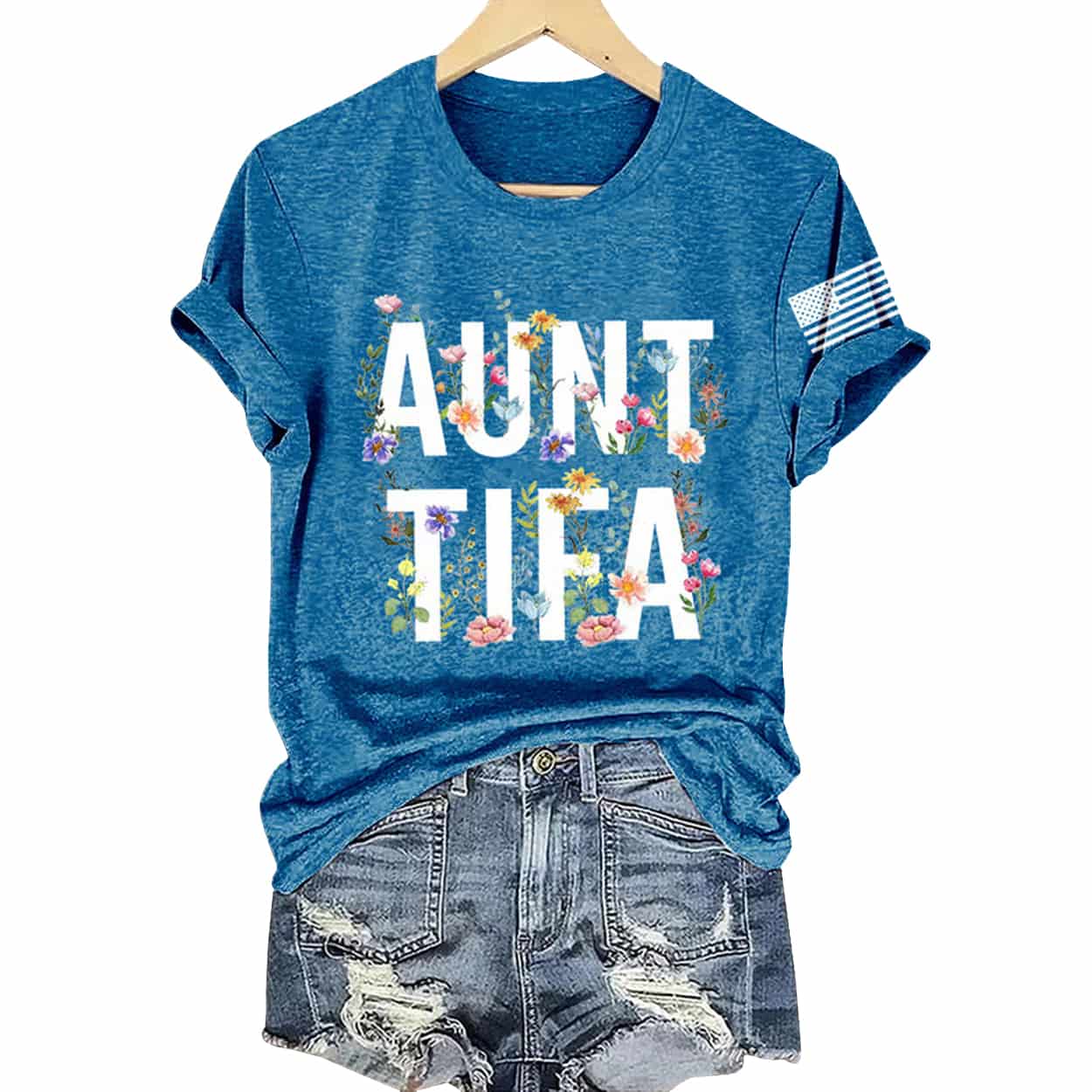 This shirt is a vibrant tribute to the aunt who’s anything but ordinary. With “AUNT TIFA” splashed across the chest in bold white letters, each letter is adorned with colorful floral accents that soften the edge while keeping the sass. A small American flag detail on the sleeve adds a subtle patriotic twist, making this tee a perfect blend of charm and conviction.