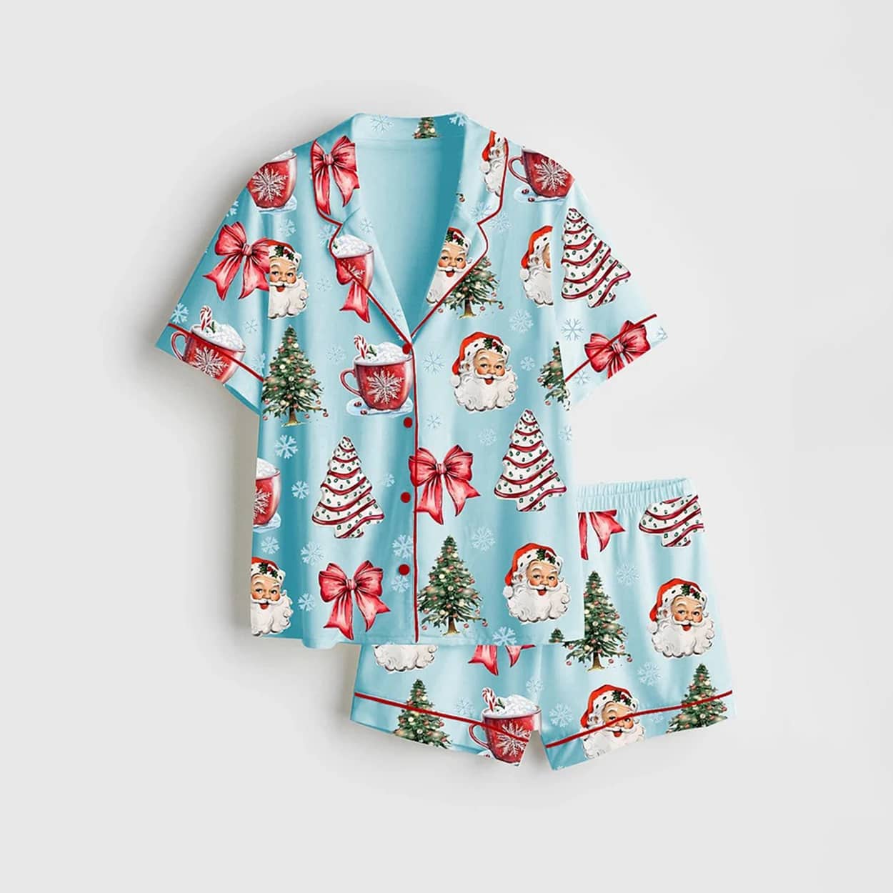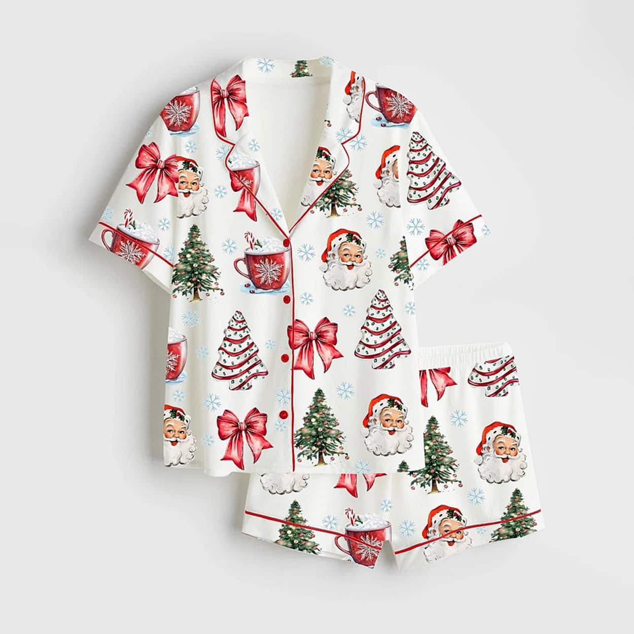 This set is your ticket to cozy, candy-cane dreams. This vibrant red two-piece features a short-sleeved button-up top and matching shorts, both adorned with a joyful collage of holiday icons. From jolly Santa faces and twinkling Christmas trees to snowflakes, bows, holly leaves, and candy canes, every inch of this set sparkles with nostalgic cheer. White piping adds a crisp, classic touch, making the ensemble feel both festive and fashion-forward.