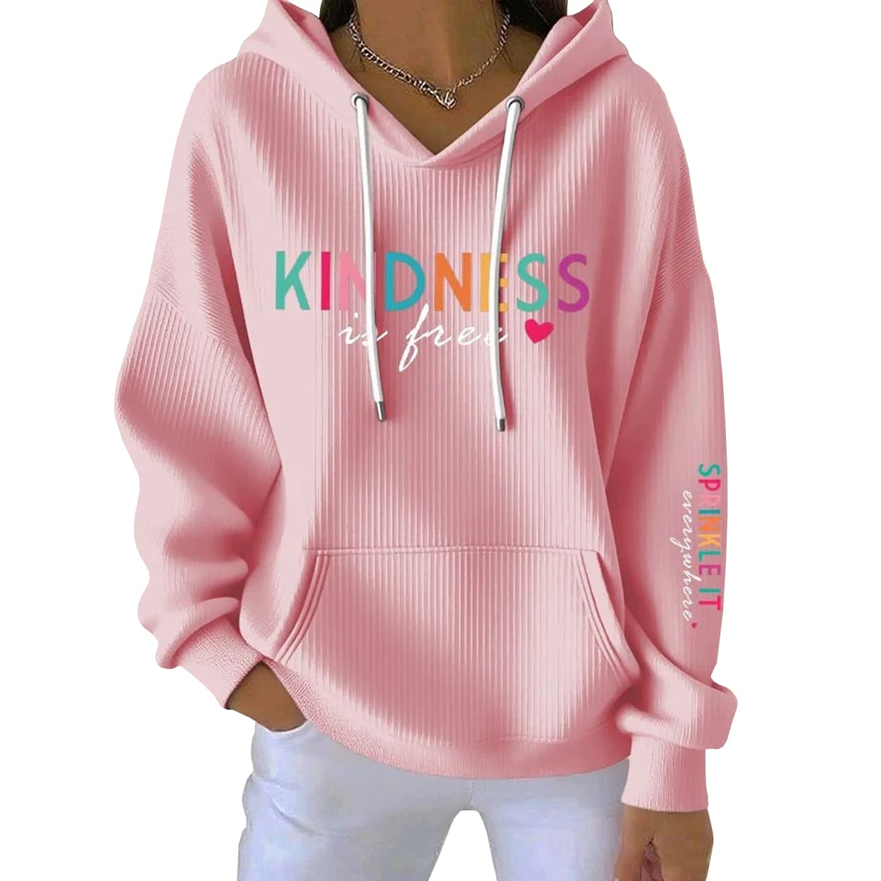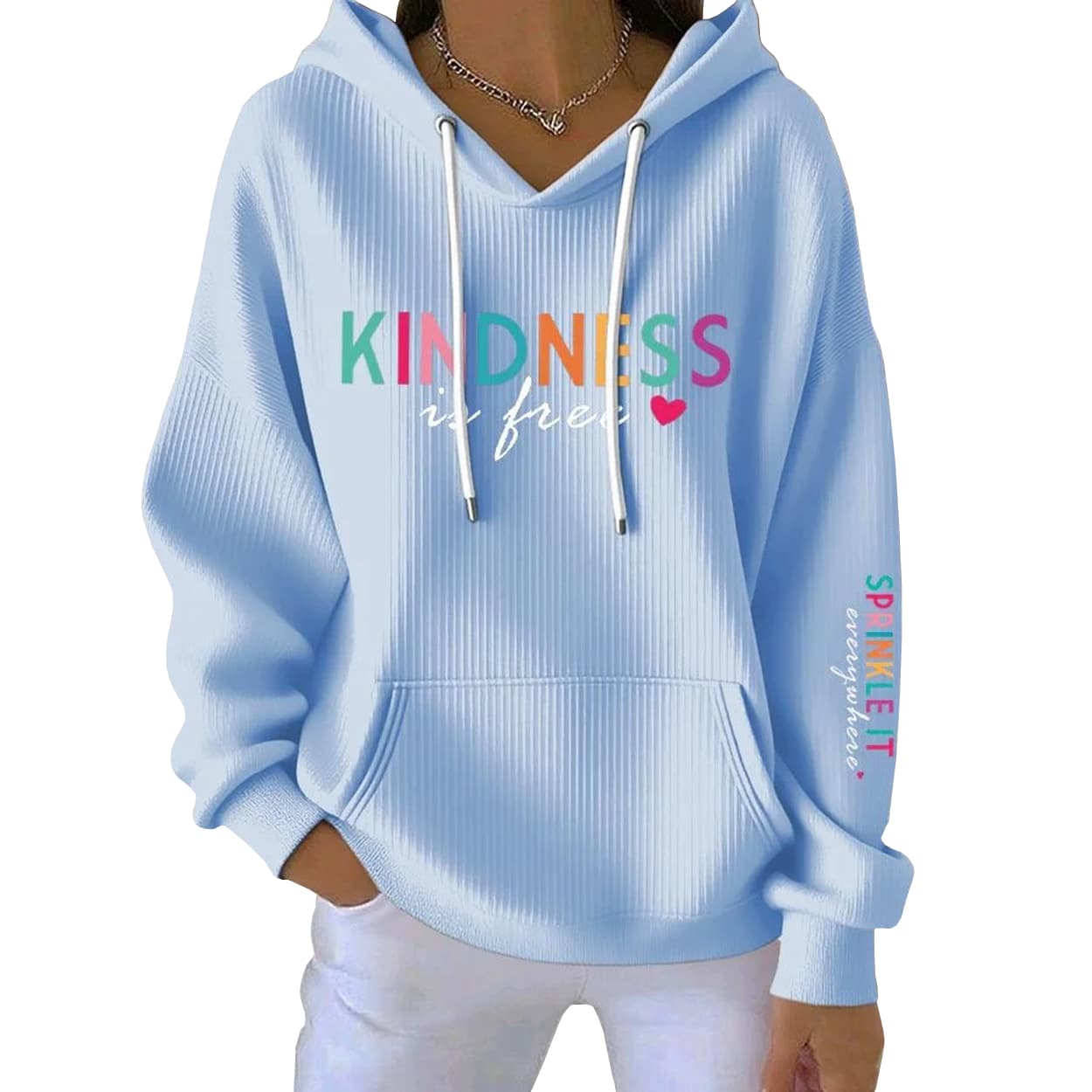 Brighten your day—and everyone else’s—with this hoodie. This light blue ribbed hoodie is a cheerful canvas for a message that matters. Across the front, “KINDNESS” pops in a rainbow of bold colors—green, pink, orange, red, and blue—followed by the phrase “is free” in playful white script, complete with a tiny red heart that seals the sentiment. White drawstrings and a front pocket round out the look with casual charm.