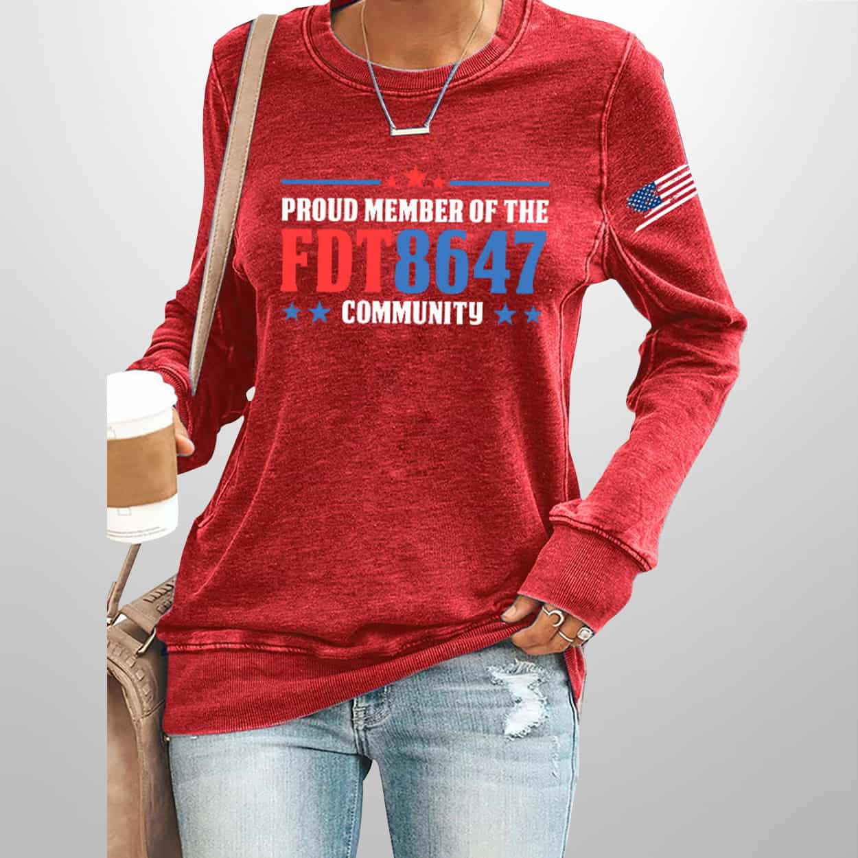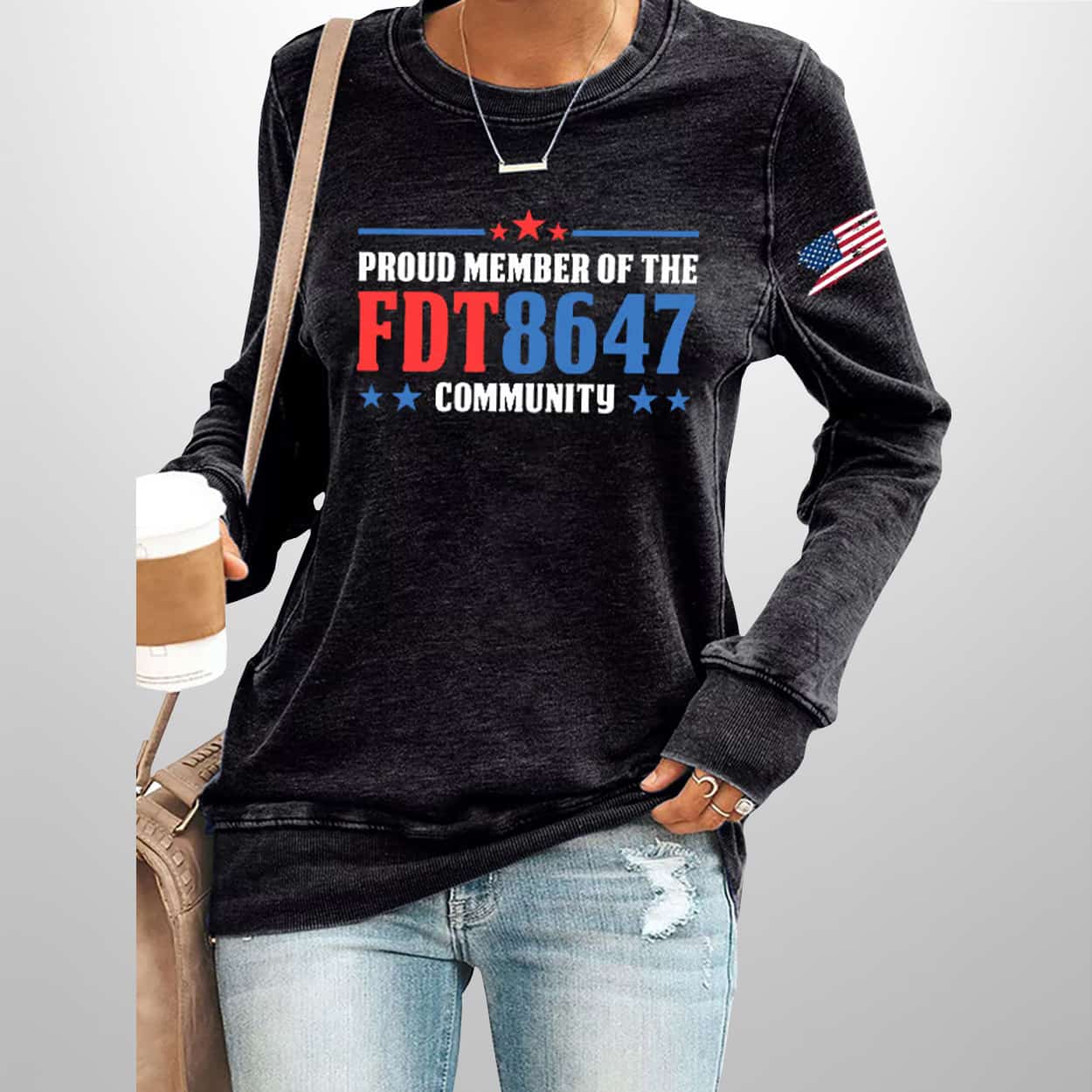 Step into the spotlight with this sweatshirt—a head-turning piece that blends classic Americana with modern edge. Featuring a bold front print that reads “PROUD MEMBER OF THE FDT 8647 COMMUNITY,” this sweatshirt is more than just cozy—it’s a conversation starter. The design pops with three red stars above and five blue stars below, framing the message like a badge of honor. The red “FDT” and blue “8647”, while the American flag on the sleeve seals the deal with patriotic flair.