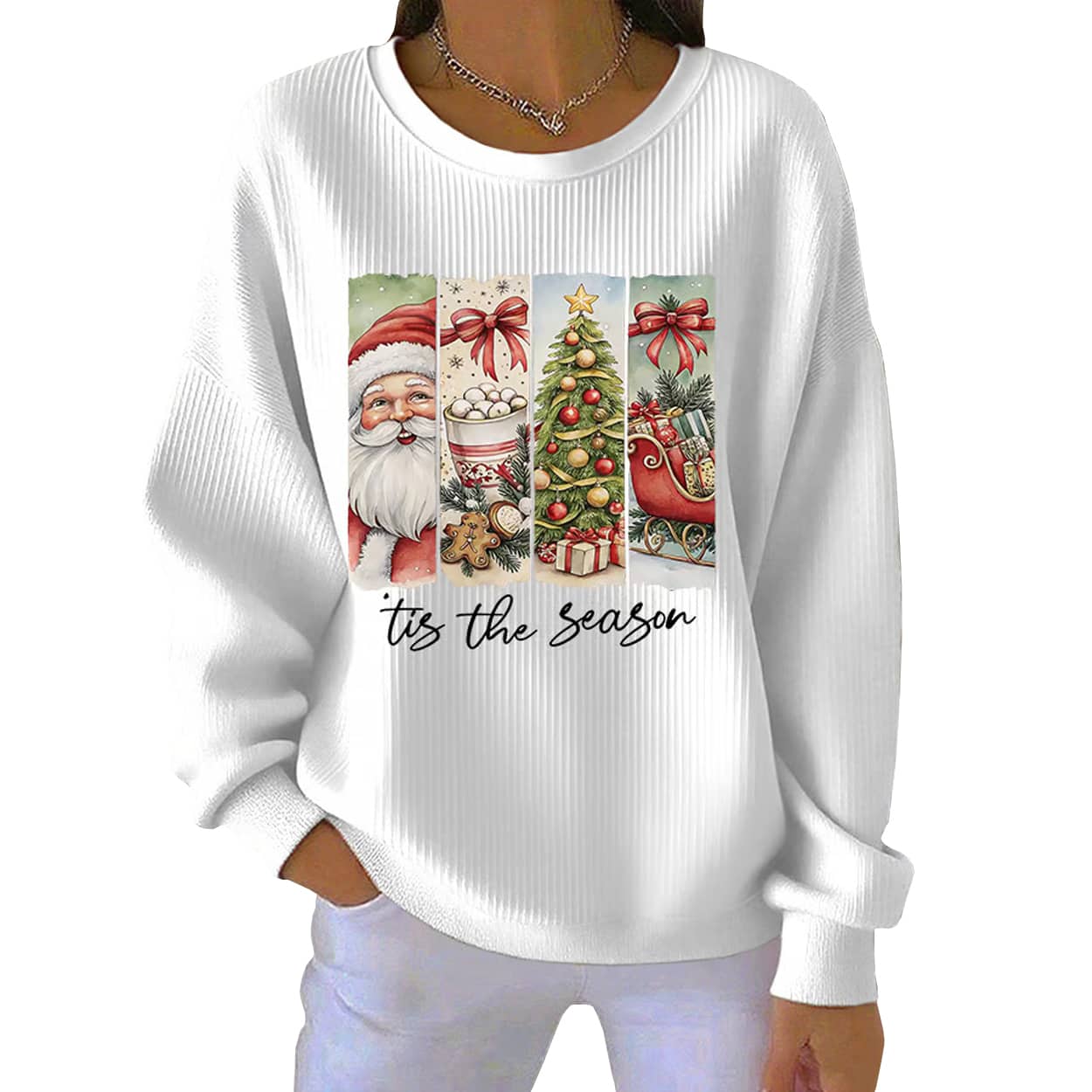 This isn’t your average holiday sweater—it’s a nostalgic nod to Christmas classics with a modern twist. The vibrant red base sets the tone, while four vertical panels across the chest showcase iconic holiday imagery: jolly Santa Claus, a tower of wrapped gifts, a twinkling Christmas tree, and a sleigh brimming with presents. Beneath the festive lineup, the phrase “’tis the season” is elegantly scripted in white cursive, adding a touch of warmth and whimsy. Ribbed detailing and a relaxed fit make it perfect for cozy gatherings or casual outings. Whether you’re sipping cocoa or wrapping gifts, this sweatshirt brings the spirit of the season front and center.