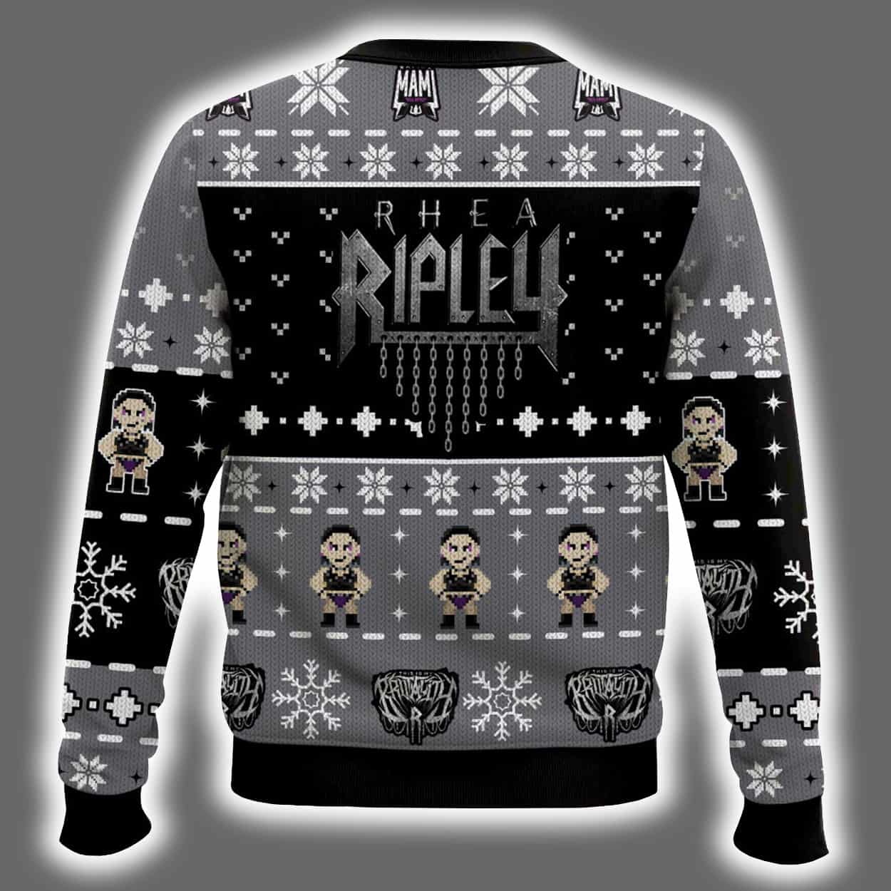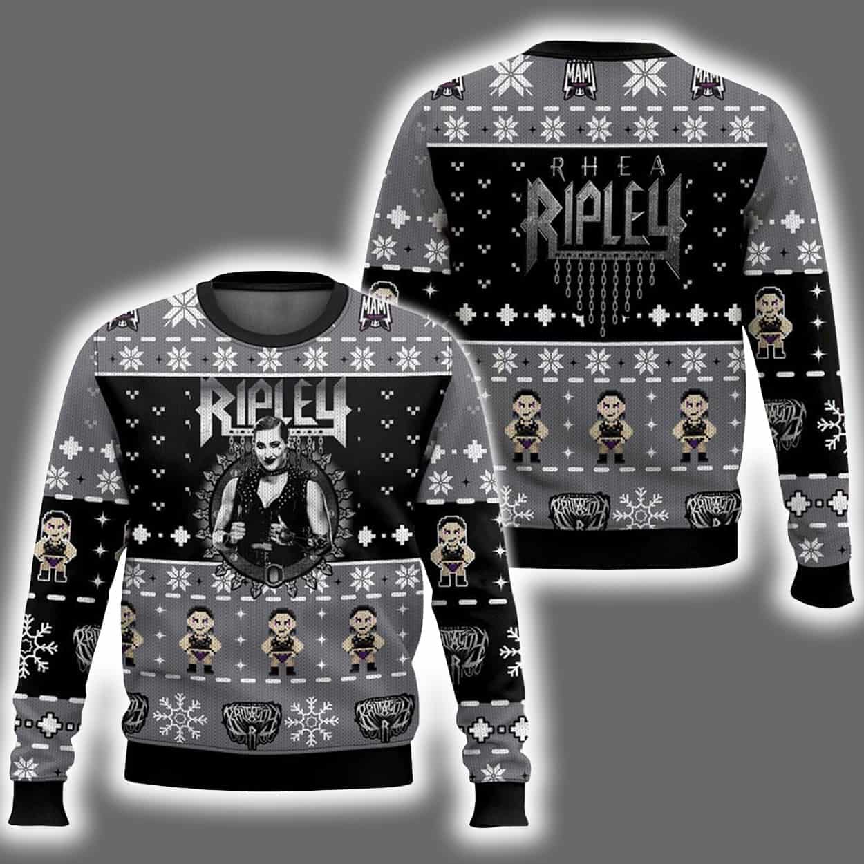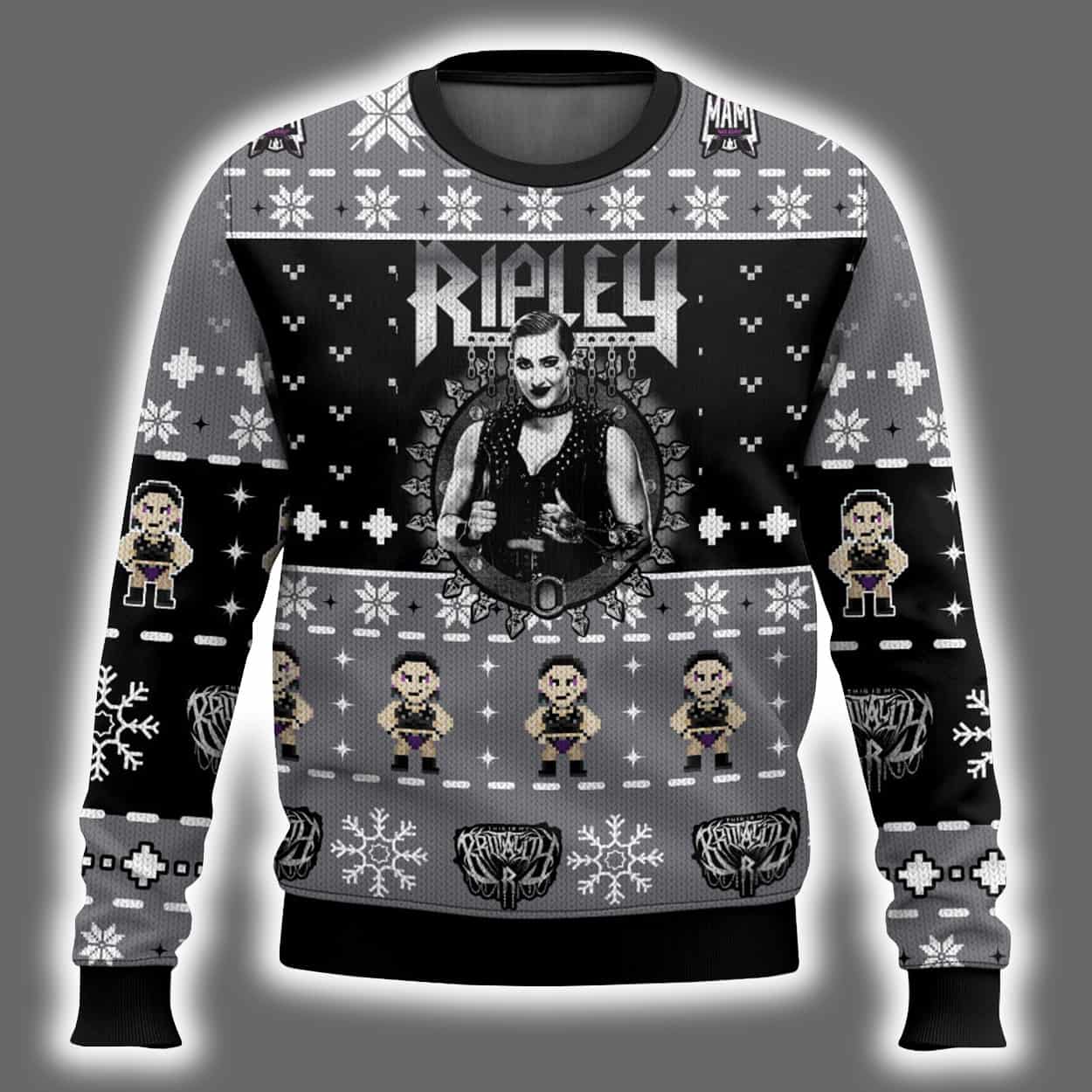 Step into the spotlight and make your holiday entrance unforgettable with this sweater. This bold design features a grayscale palette accented with pops of red and purple, showcasing snowflakes, reindeer, and dynamic graphics of Rhea Ripley in her signature poses. Her name is emblazoned across the front and back in a stylized font that commands attention, while the symmetrical layout of festive icons adds a touch of seasonal charm to her unmistakable edge.