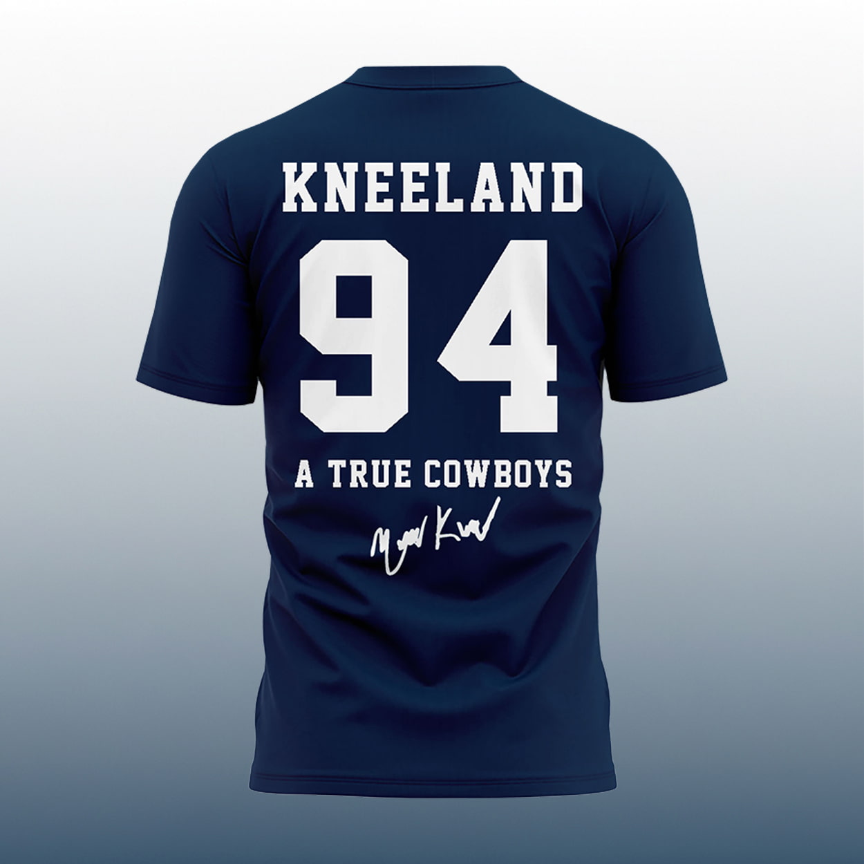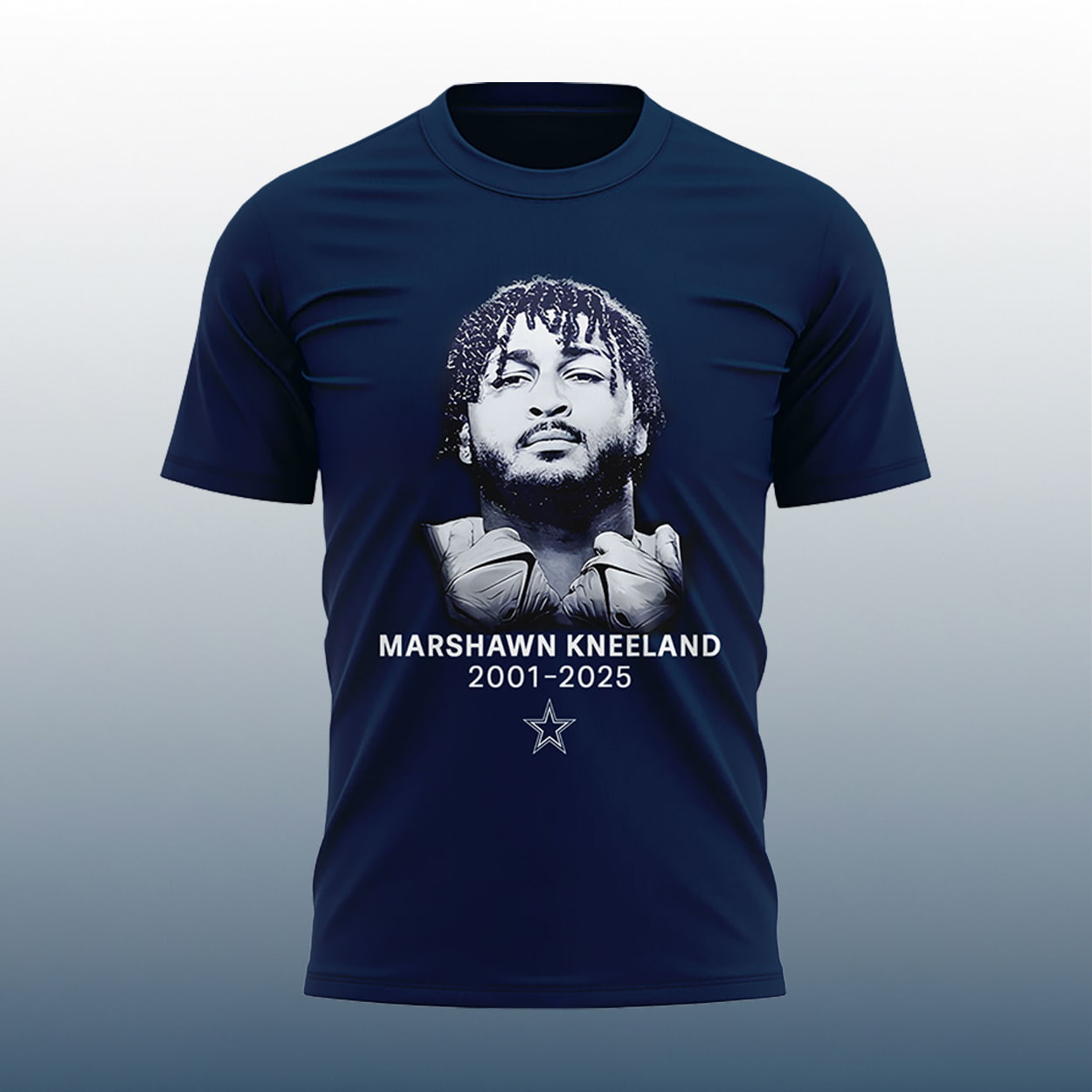 This shirt is a heartfelt homage to a life lived with purpose and power. On the front, a grayscale portrait of Marshawn Kneeland commands attention, framed by the dates “2001–2025” and the name that echoes strength. Beneath the image, a star graphic and signature-style detail add a personal touch. Flip to the back, and you’ll find “KNEELAND” emblazoned across the shoulders, with the bold number “94” standing tall. Below it, the phrase “A TRUE COWBOYS” reminds us of the grit, loyalty, and spirit that defined him.