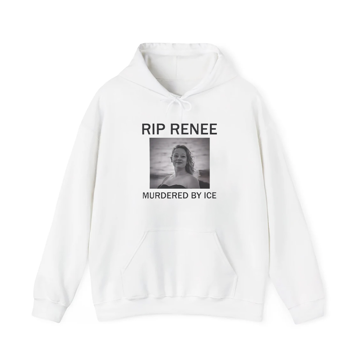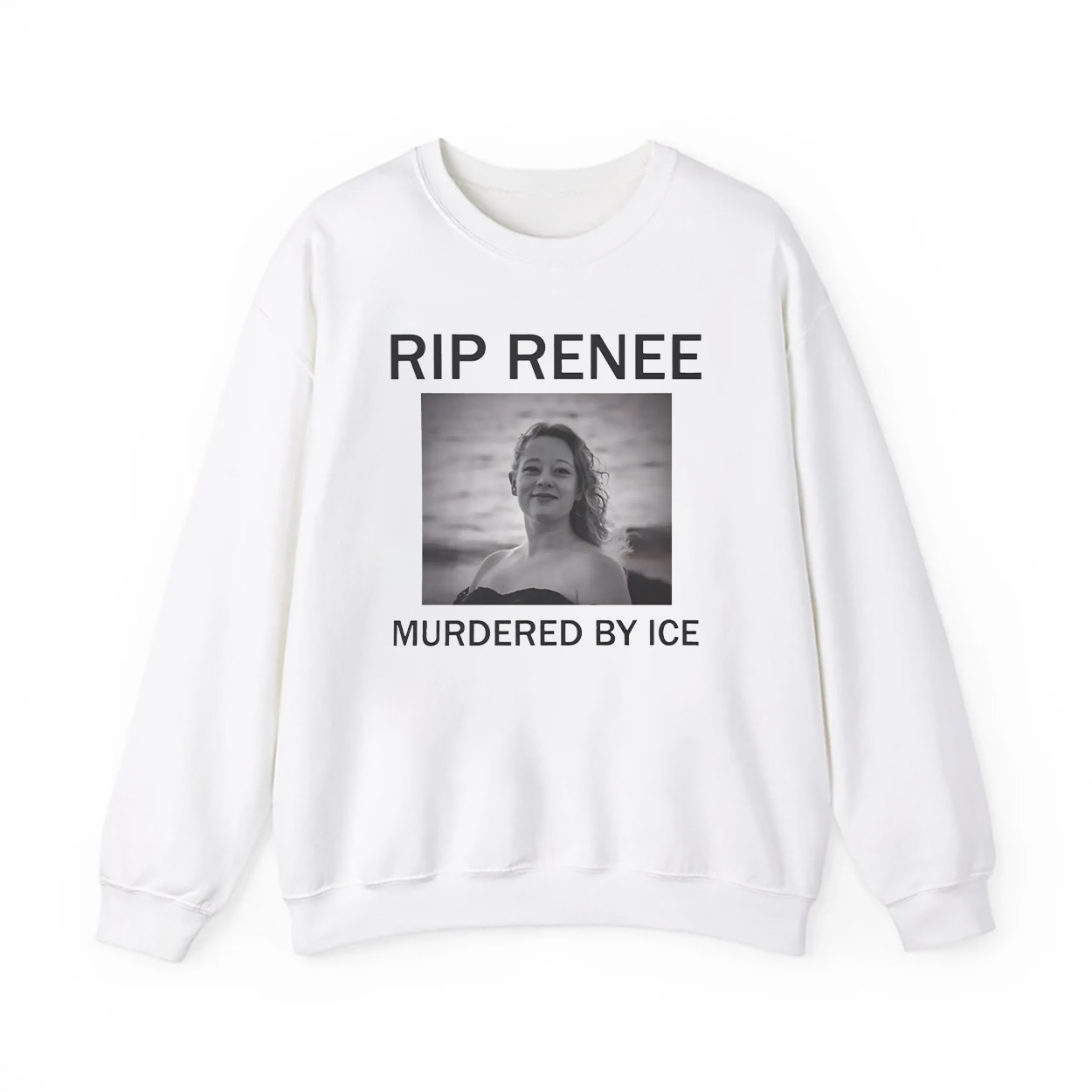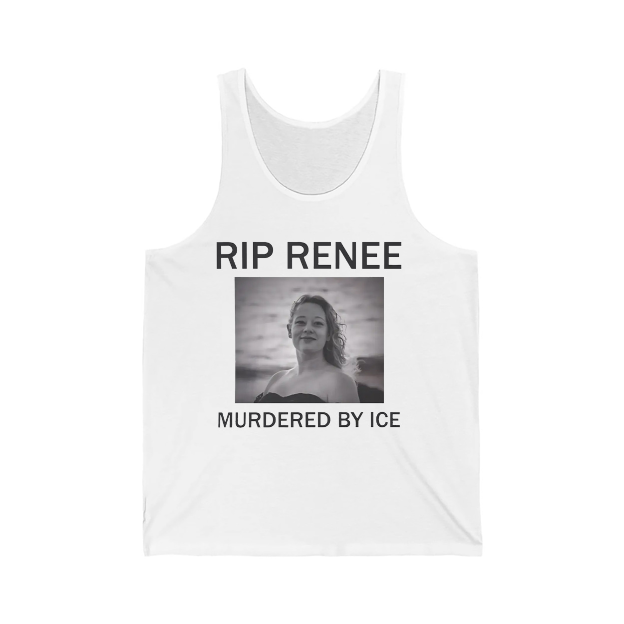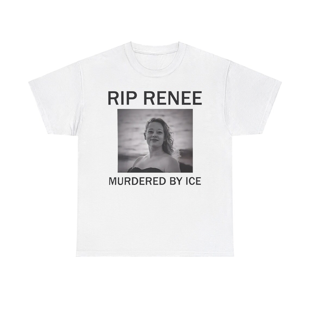 This shirt isn’t just fashion—it’s a megaphone. Featuring a striking black-and-white photo of Renee Nicole Good, framed by bold text that reads “RIP RENEE” above and “MURDERED BY ICE” below, this design is impossible to ignore. The image captures Renee’s strength and spirit, standing tall with her curly hair and serene gaze, set against a blurred waterscape. It’s a wearable tribute that turns heads and opens hearts.